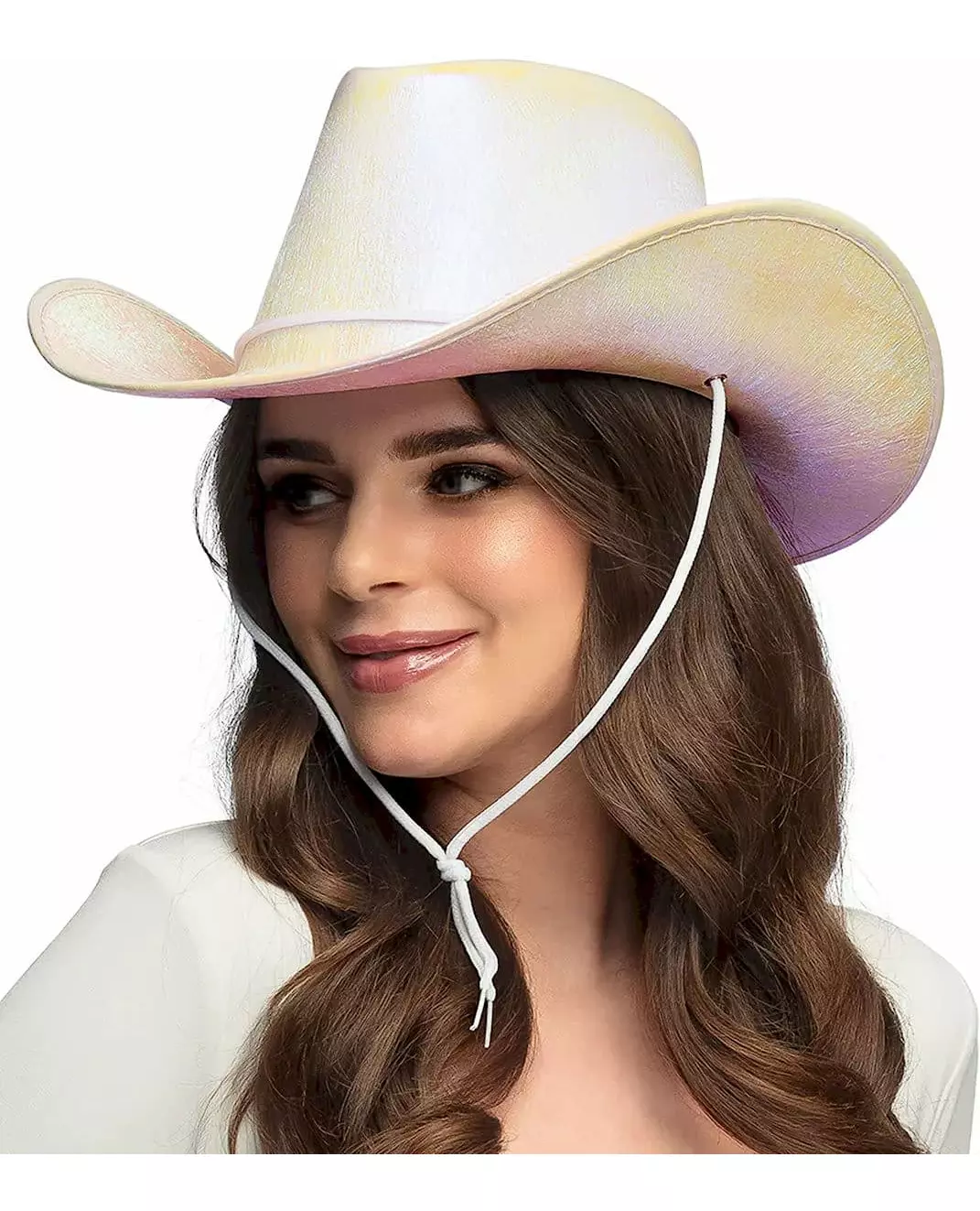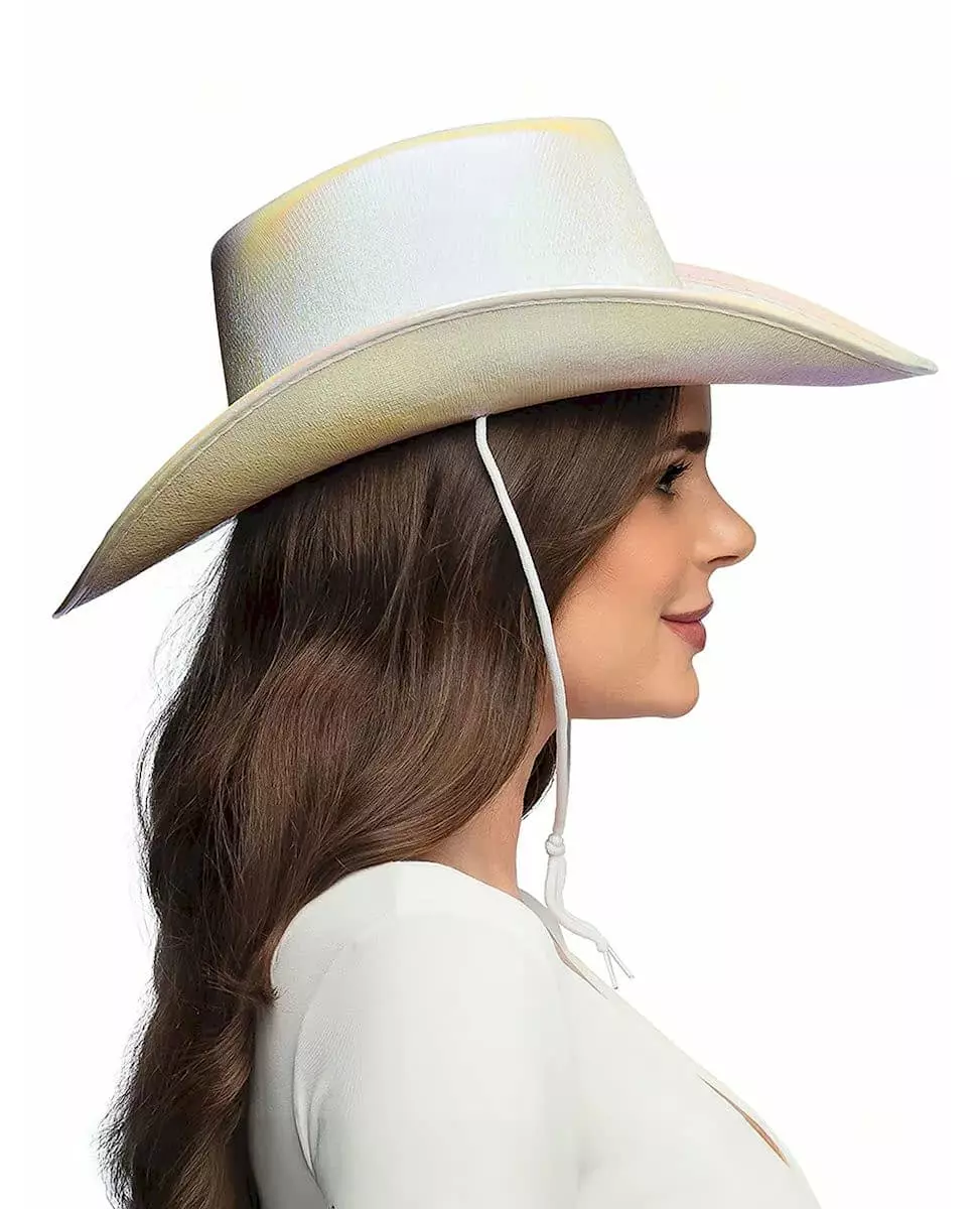 Skinn sterkt med denne elegante, skimrende hatten! Denne iriserende hvite hatten er designet for voksne. Inspirert av det ville vesten, har denne cowboyhatten justerbar hvit blonde for perfekt passform. Den iriserende effekten gir den en unik glans, som avslører rosa, hvite og gule detaljer. Ideell for å fullføre et cowboy- eller cowgirl-antrekk, og vil være perfekt for en temafest eller et karneval. Inkludert tilbehør: Hatt