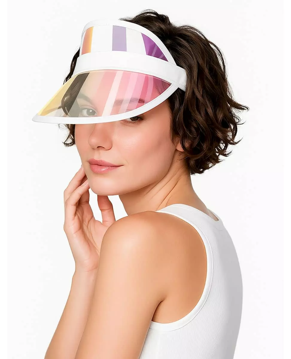 Wow-effekt garantert! Denne iriserende solskjermen for voksne er det perfekte tilbehøret for å gi festantrekket ditt et prangende og trendy preg. Gjennomsiktig med flerfargede refleksjoner, kombinert med et hvitt pannebånd, fremkaller den popfulle og fargerike verdenen fra 80-tallet. Den fanger lyset og tiltrekker seg alles øyne, ideelt for et utseende som er både morsomt og stilig. Et originalt tilbehør, perfekt for å skinne på karneval, et utdrikningslag eller en retro- eller fluorescerende kveld. Inkludert tilbehør: 1 solskjerm