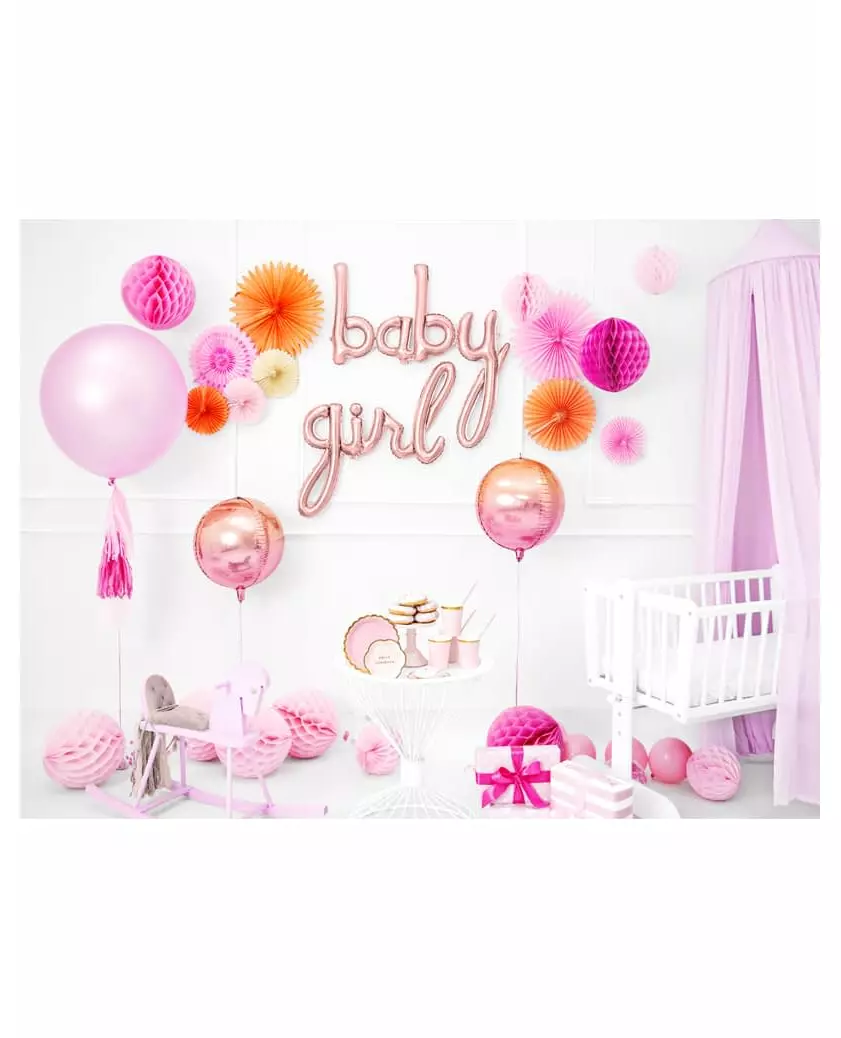 Lag en jentete dekorasjon til babyshoweren din! Denne folieballongen er roségullfarget. Den representerer ordet «jente» og måler omtrent 77 x 70 cm. Du kan blåse den opp med luft og henge den over buffeten din til babyshoweren. Inkludert tilbehør: 1 ballong Materiale: Aluminium