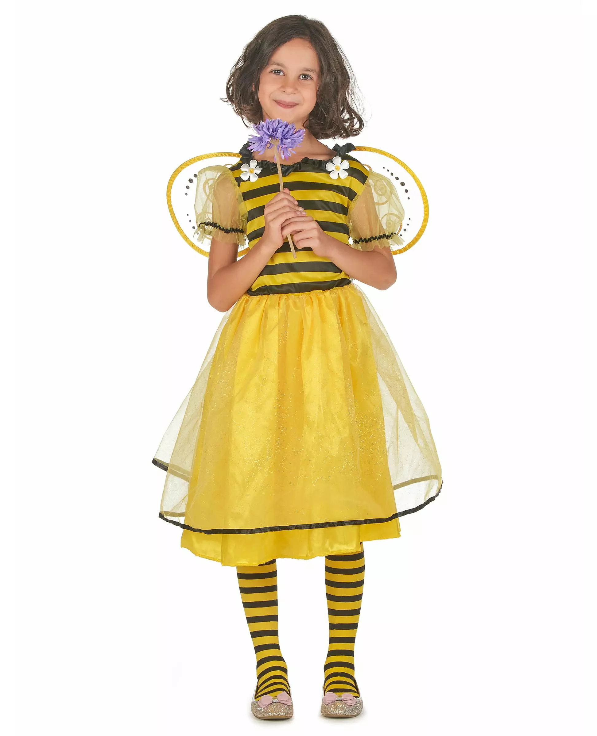 Den vakreste bien! Dette bie-tyllkostymet er for jenter. Det inkluderer en kjole og et par vinger. Kjolen er laget av gult satengstoff på skjørtet og svarte og gule striper på toppen. Nederdelen av kjolen er foret med et pent gjennomsiktig gult slør. De korte puffermene er også laget av gult slørstoff med en liten svart stripe. Til slutt er det to pene små stofftusenfryd på skuldrene. Et par vinger, også i et gjennomsiktig gult slør, er festet til baksiden av kjolen. Den er dekorert med pene gull-, glitrende og svarte mønstre. Et perfekt biekostyme til en skolefest, karneval eller bursdagsfest med dyretema. Inkludert tilbehør: Kjole 1 par vinger Materiale: 100 % polyester Vedlikehold: Håndvask