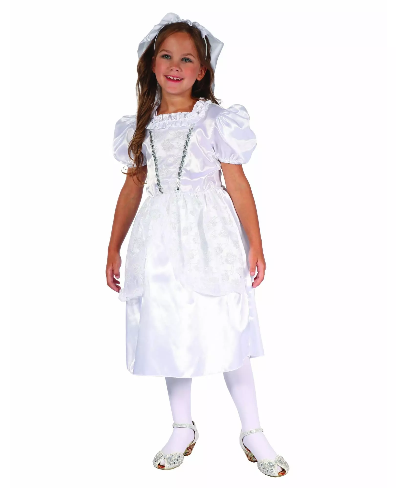 Bli den vakreste bruden! Dette brudekostymet for jenter består av en kjole og et hodeplagg (strømpebukser og sko er ikke inkludert). Den hvite satengkjolen har korte, elastiske puffermer. Et slør med paljettbesatte blomstermønstre og sølvpaljetter finnes ved bysten. Vi finner det samme paljettbesatte sløret i livet. Denne kjolen er elastikk bak i livet og lukkes med borrelås. En liten underskjørt er sydd under kjolen for å gi den volum. Et hvitt brudeslør fullfører kjolen. Sateng, det er festet til et pannebånd. Dette kostymet vil være perfekt for å leke brud på en utkledningsfest eller til karneval. Inkludert tilbehør: Kjole Hodeplagg Materiale: 100 % polyester Vedlikehold: Håndvask
