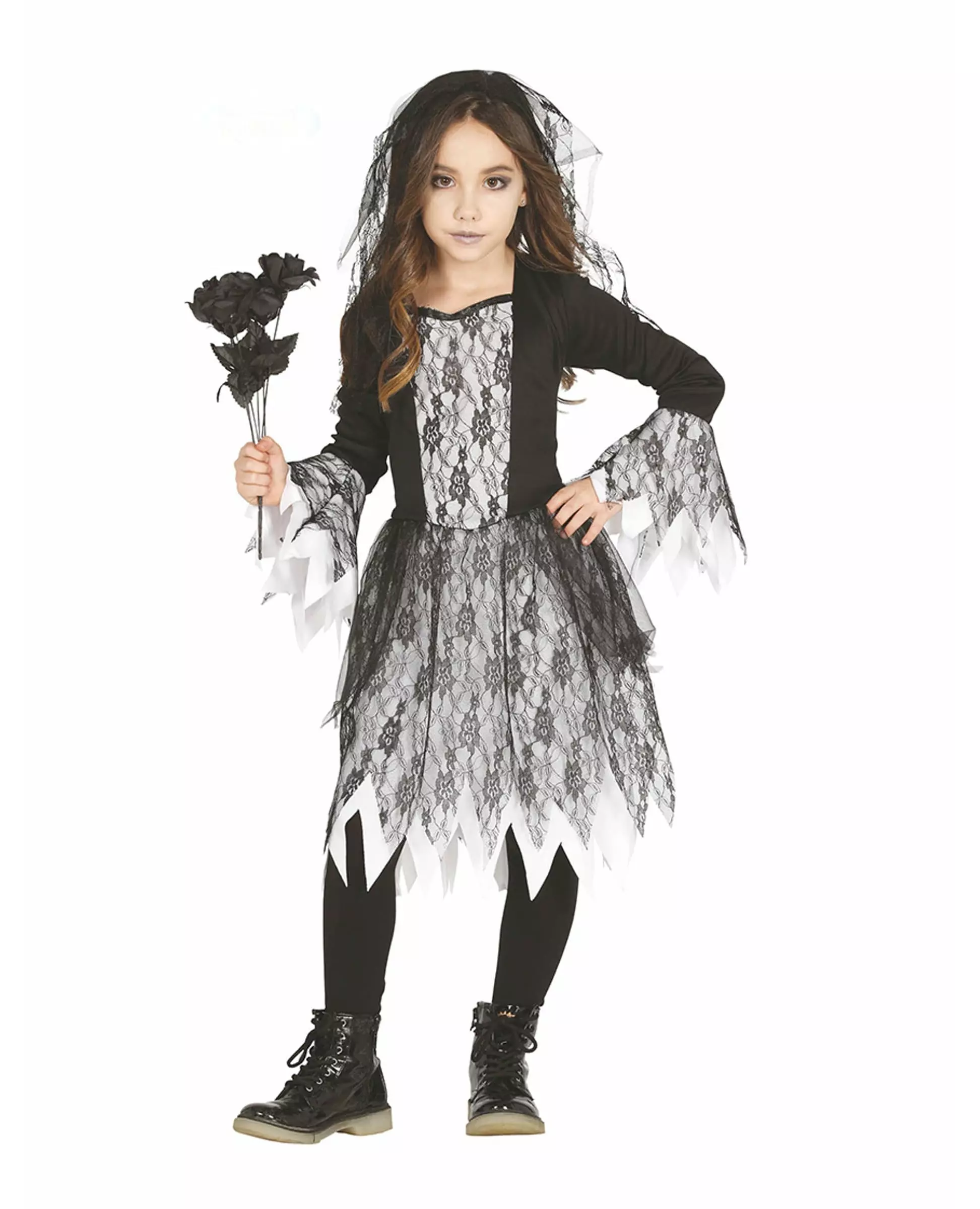 Et lite brudkostyme til Halloween! Dette udøde brudkostymet for jenter består av en kjole og et slør (bukett, strømpebukser og sko er ikke inkludert). Kjolen er hvit med svart blonder på underskjørtet og overdelen. Ermene er svarte. Sløret er laget av svart blonder, festet til et pannebånd. Dette udøde brudkostymet vil være perfekt for datteren din å sjarmere på Halloween-kvelden! Inkludert tilbehør: Kjoleslør Materiale: 100 % polyester Vedlikehold: Håndvask