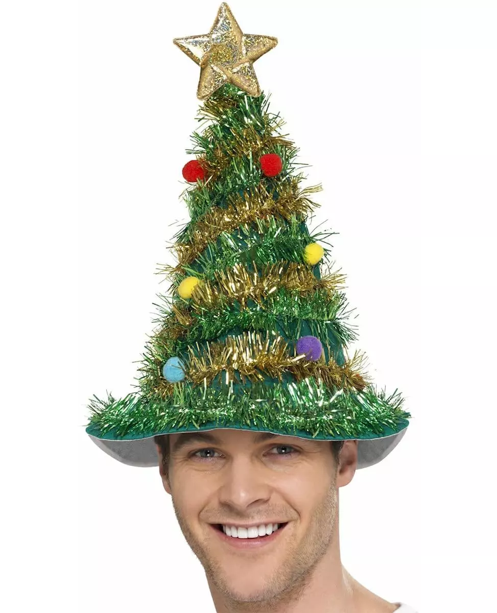 Spill humorkortet til jul. Denne spisse, grønne hatten forestiller et pyntet juletre. Den måler omtrent 38 cm i høyden. Den er dekorert med små fargede kuler i rødt, gult, blått og lilla. En gyllen stjerne er plassert på toppen av treet. Dette tilbehøret vil gi antrekket ditt et snev av humor i juleferien. Inkludert tilbehør: Hatt. Materiale: 100 % polyester. 100 % polyester.