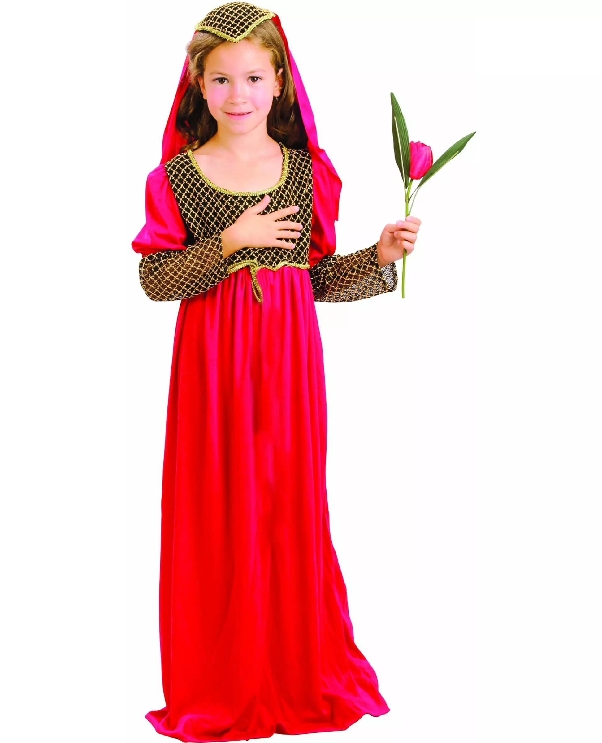 Romeo, hvorfor er du Romeo? Dette Julie-kostymet for jenter består av en kjole og et hodeplagg (rosa ikke inkludert). Den lange kjolen er rød. Brystet og ermene er svarte med gullbroderi. Midjen, markert under brystet, er elastisk. Det matchende hodeplagget er svart og gull på toppen av hodet. Et rødt stoff vil falle på bakhodet. Dette hodeplagget vil holdes på plass med en plastkam. Dette kostymet vil være perfekt for å spille den vakre Julie under et show eller på karneval. Inkludert tilbehør: Kjole Hodeplagg Materiale: 100 % polyester Stell: Håndvask Målinformasjon: For størrelse 7/9 år (M), kjole ca. 110 cm lang