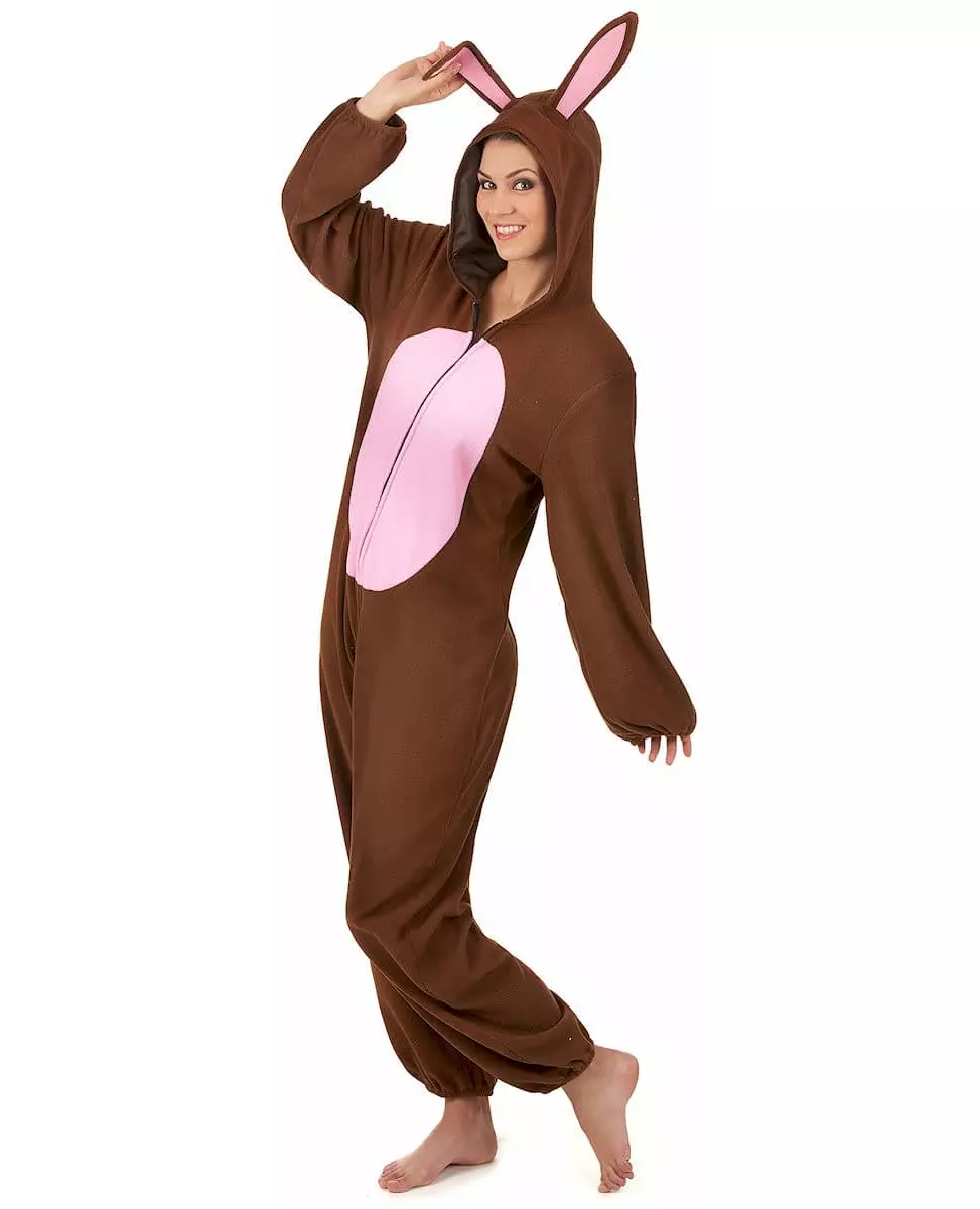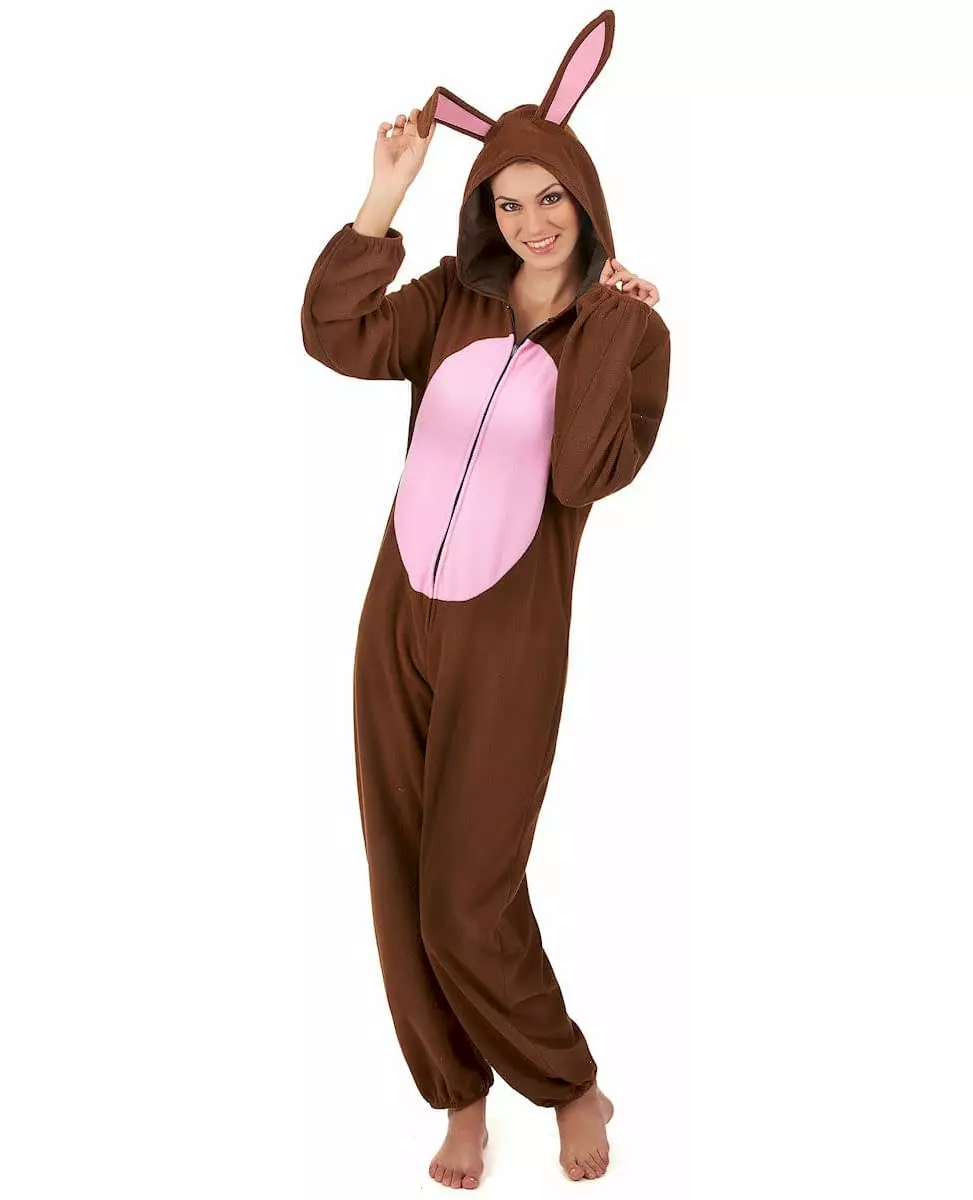 En veldig myk jumpsuit! Dette kaninkostymet for kvinner er en jumpsuit. Den brune jumpsuiten er laget av fleece-effekt. Magen og innsiden av ørene er rosa for en søt effekt! Jumpsuiten lukkes foran med glidelås, og ørene har en ramme slik at du kan brette dem sammen hvis du ønsker det. Den er tilgjengelig i én størrelse og måler 155 cm i lengden (uten hette). Velg dette søte og morsomme kostymet til en temafest eller et karneval. Inkludert tilbehør: Jumpsuit Materiale: 100 % polyester Vedlikehold: Håndvask