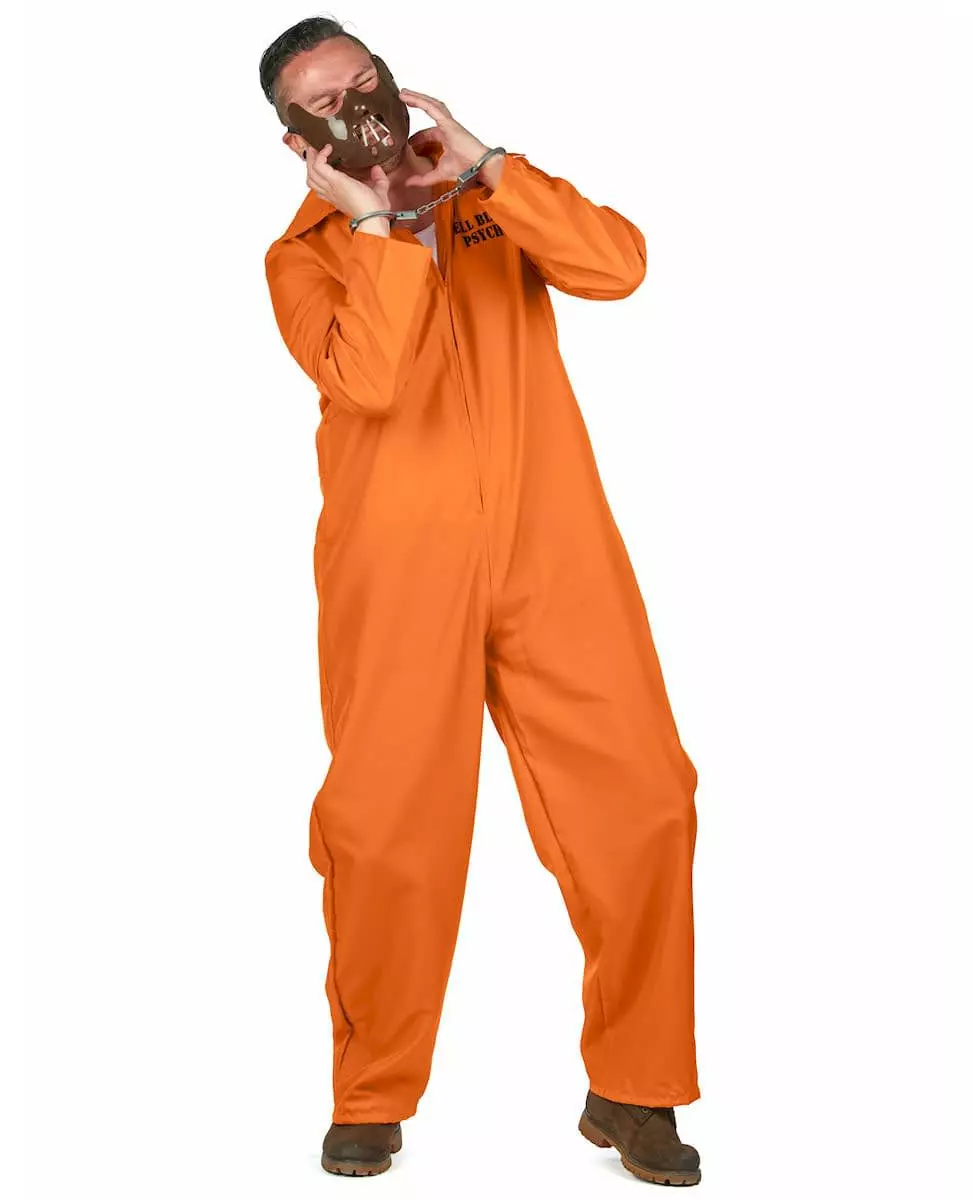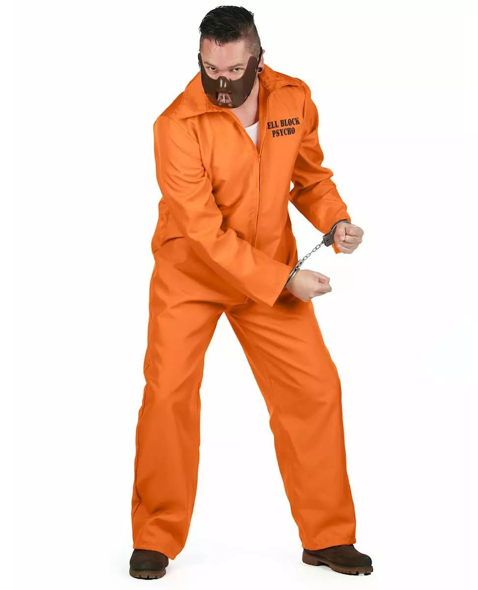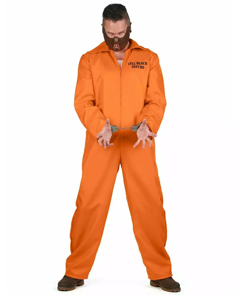 Se opp for bitt! Dette kannibalfangekostymet består av en jumpsuit, et par håndjern og en maske. Den oransje jumpsuiten har lange ermer. Den har en glidelås foran som gjør at du enkelt kan ta den på. Innskriften «cell block psycho» er på forsiden av dette kostymet. Den brune halvmasken i plast har to strikker som føres bak hodet for en god passform på ansiktet ditt. Masken vil dekke den nedre delen av ansiktet ditt for å unngå kannibalbitt. De grå håndjernene vil fullføre ... Dette vanvittige fangeantrekket er et vidunder. Det perfekte kostymet for å skremme dine kjære denne Halloween! Inkludert tilbehør: Jumpsuit Halvmaske Håndjern Materiale: 100 % polyester Vedlikehold: Håndvask