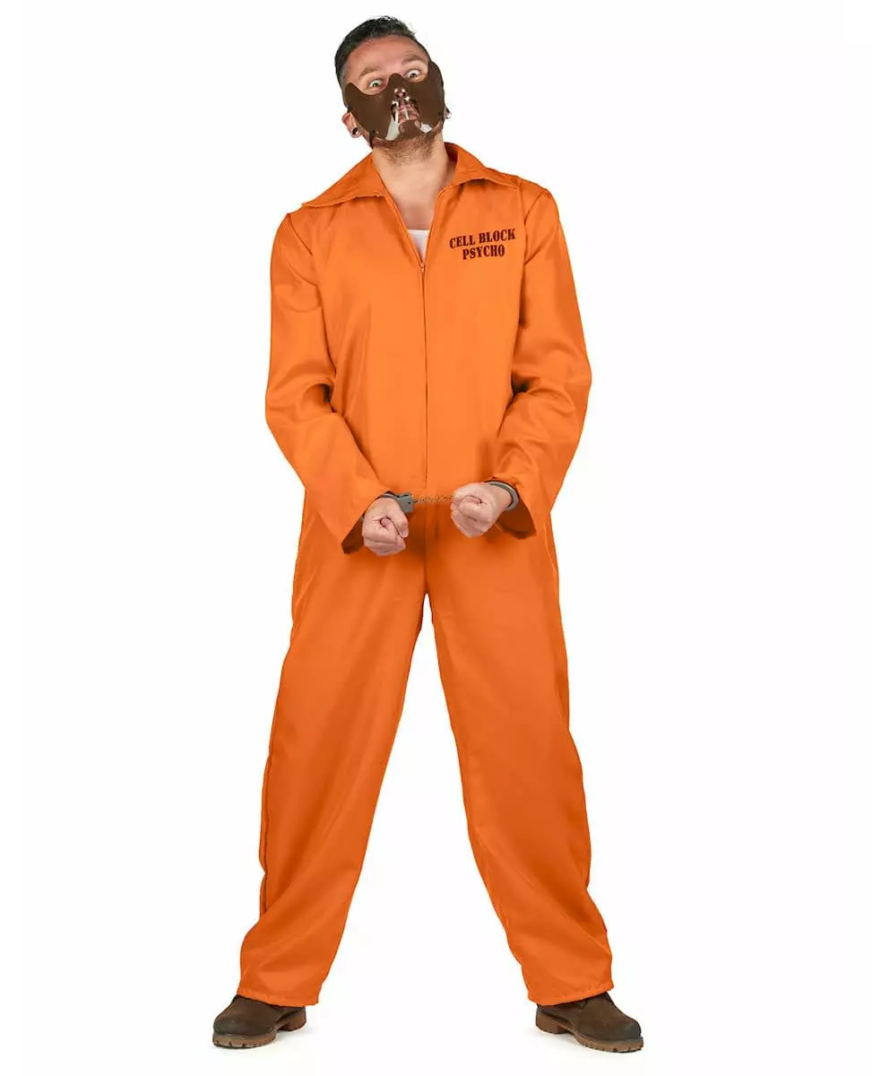 Se opp for bitt! Dette kannibalfangekostymet består av en jumpsuit, et par håndjern og en maske. Den oransje jumpsuiten har lange ermer. Den har en glidelås foran som gjør at du enkelt kan ta den på. Innskriften «cell block psycho» er på forsiden av dette kostymet. Den brune halvmasken i plast har to strikker som føres bak hodet for en god passform på ansiktet ditt. Masken vil dekke den nedre delen av ansiktet ditt for å unngå kannibalbitt. De grå håndjernene vil fullføre ... Dette vanvittige fangeantrekket er et vidunder. Det perfekte kostymet for å skremme dine kjære denne Halloween! Inkludert tilbehør: Jumpsuit Halvmaske Håndjern Materiale: 100 % polyester Vedlikehold: Håndvask
