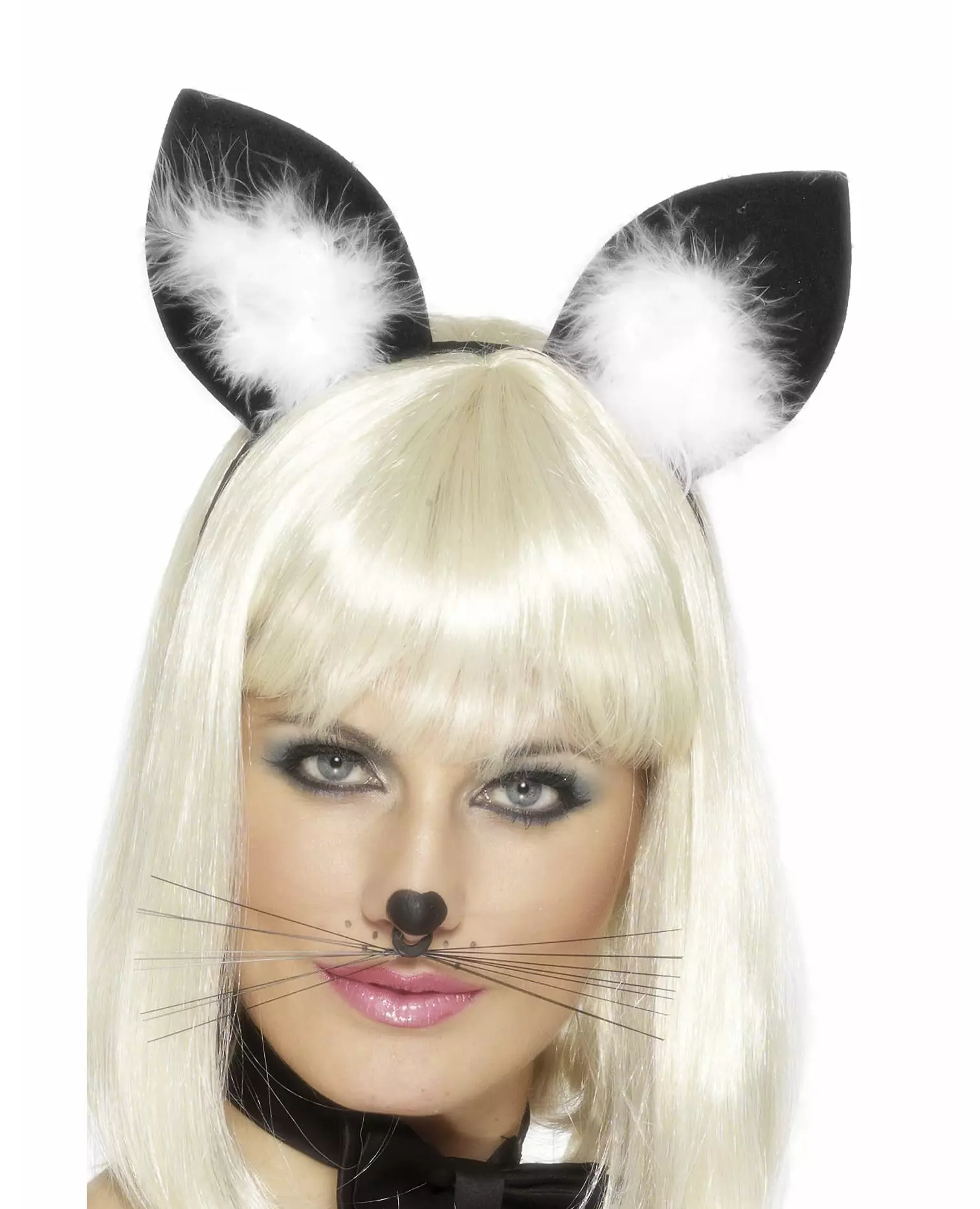 Bli den mest katteaktige av alle! Dette svarte pannebåndet har store katteører. Det er dekorert med hvite fjær. Det er det ideelle tilbehøret for å fullføre et kattekostyme til karneval. Inkludert tilbehør: Pannebånd