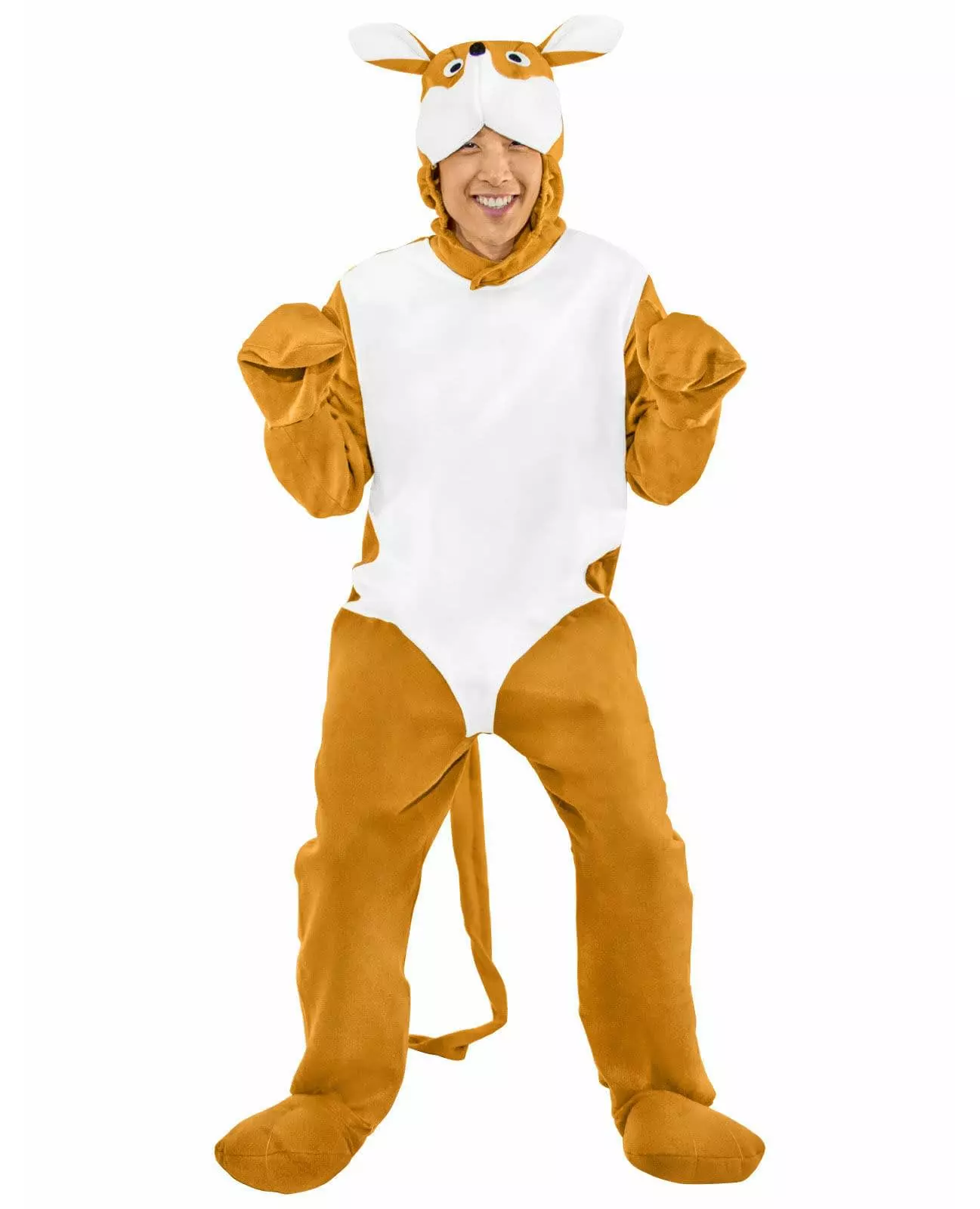 Importert direkte fra Australia! Dette unisex kengurukostymet inkluderer en heldekkende drakt med hode og hale. Kostymet består av en jumpsuit med velour-effekt, med hvitt på overkroppen og lysebrunt på resten av kroppen, som imiterer en kenguru. For et ekstra preg av autentisitet har kostymet en lang hale, votter og en hette med «kenguruhode», med ører, nese og munn. Dette unisex kengurukostymet er originalt for et karneval, en kostymefest med dyretema eller en fest med australsk tema. Inkludert tilbehør: Jumpsuit med hette og hale Materiale: 100 % polyester Pleie: Håndvask