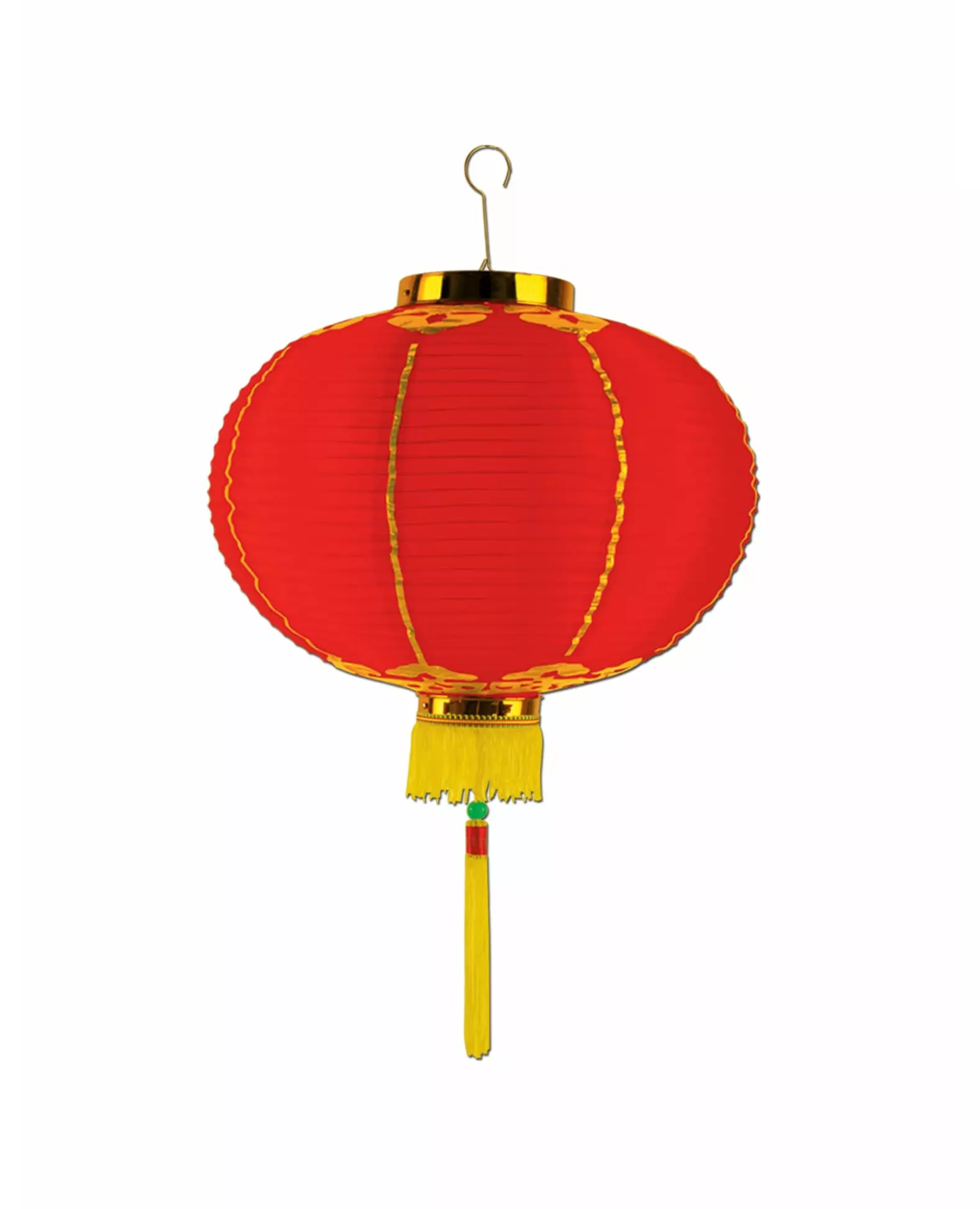 Lys opp hjemmet ditt til kinesisk nyttår! Kinesisk lykt med en diameter på 20 cm i rødt stoff med gullmønstre og krok for enkel opphenging. Denne dekorasjonen vil være ideell for asiatiske kvelder. Inkludert tilbehør: 1 lykt. Materiale: Stoff.