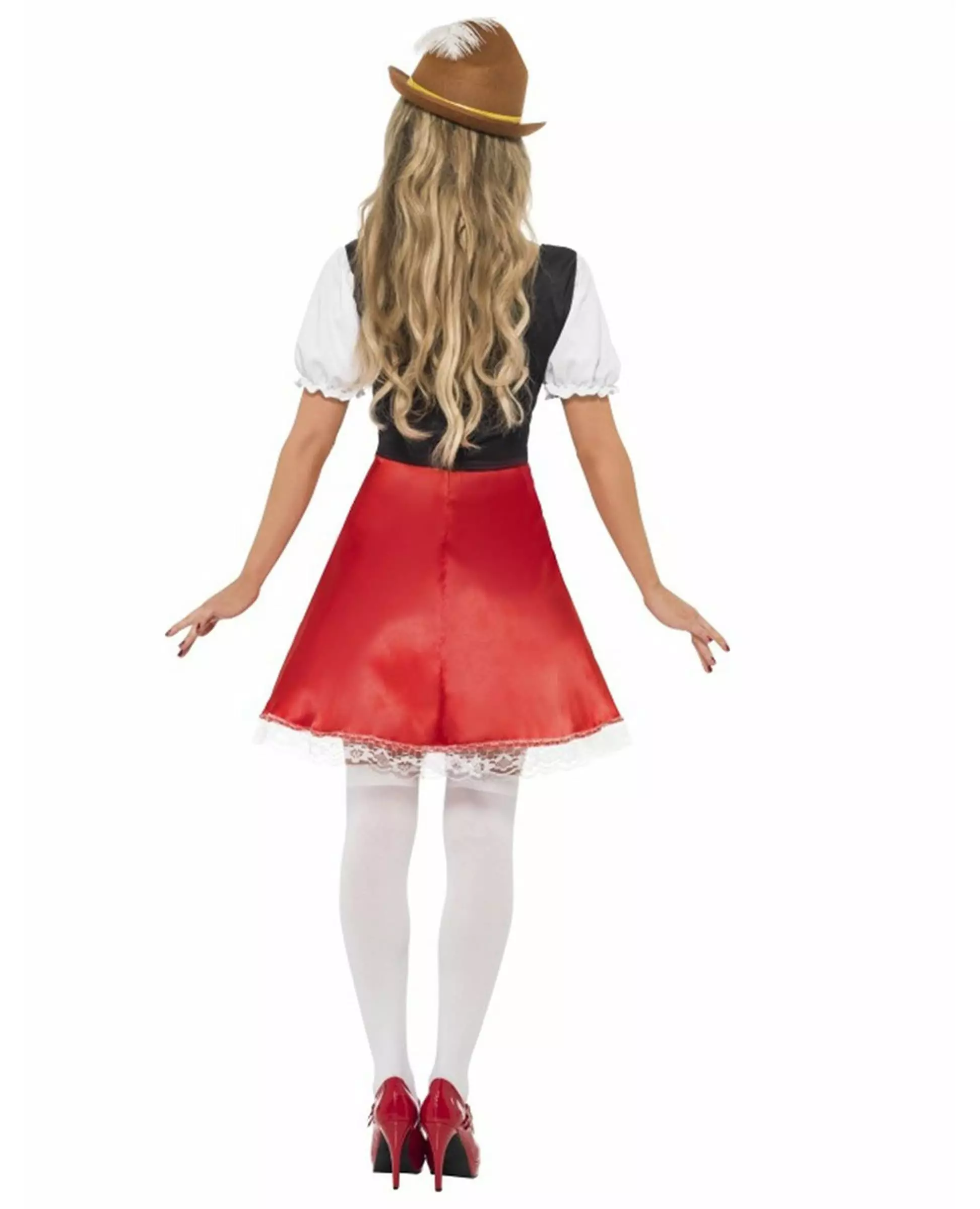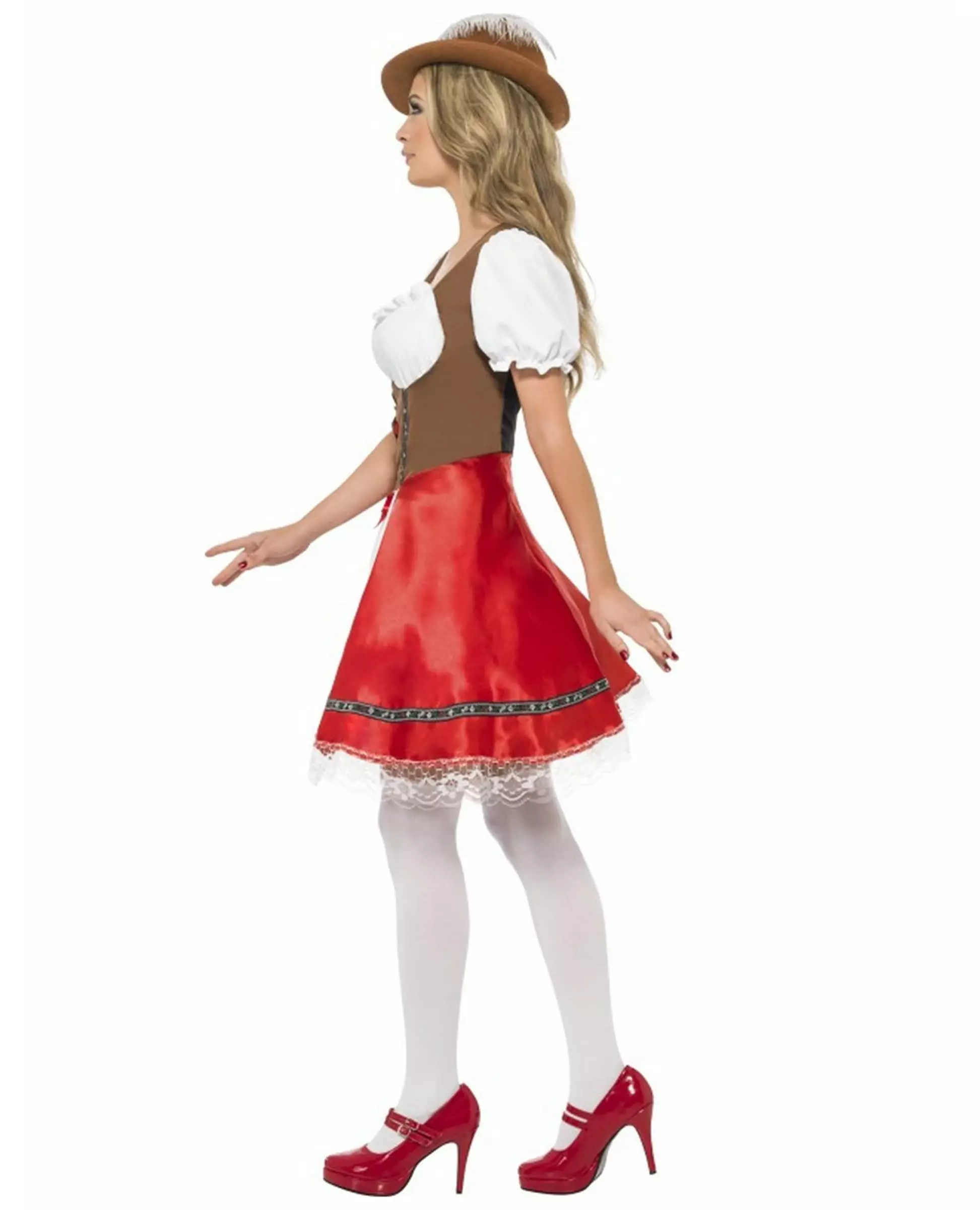 Oktoberfest! Dette bayerske kostymet for kvinner består av en kjole. Kjolens overdel er brun og hvit, med blomsterkant på bysten. Rød satengsnøring er også på forsiden. For å sikre at kjolen passer best mulig til figuren din, er halsutringningen og ermene elastiske. Kjolens underdel er i rød sateng. Den er dekorert med blomsterkant og hvit blonde. Et lite hvitt forkle følger også med. Kjolen er enkel å ta på takket være en lang glidelås bak. Dette kostymet vil være perfekt for å gli inn i huden til en ekte bayersk kvinne på en utkledningsfest eller under Oktoberfesten. Inkludert tilbehør: Kjole Materiale: 100 % polyester Pleie: Håndvask Målinformasjon: Størrelse M: kjole 72 cm lang Størrelse L: kjole 78 cm lang