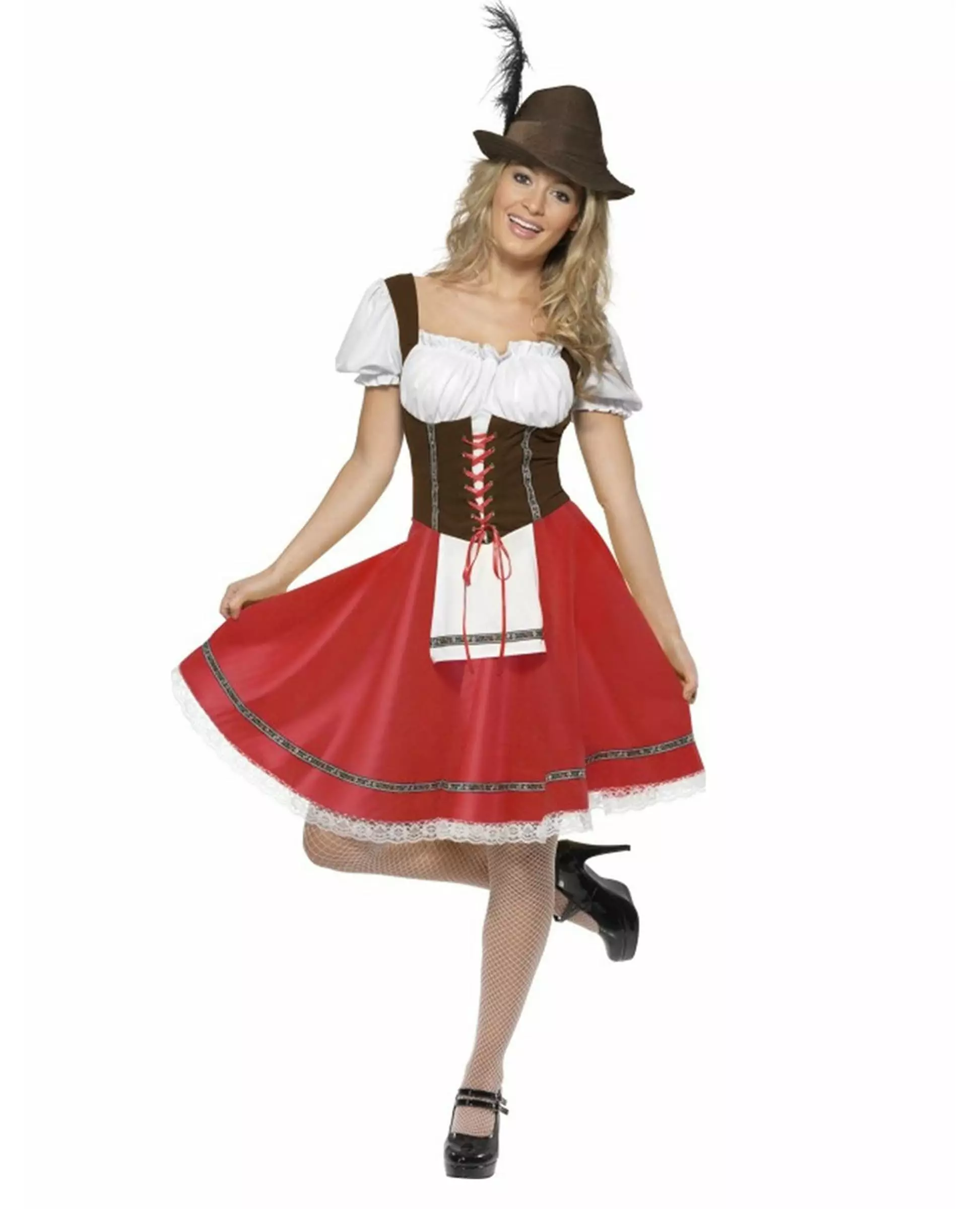 Oktoberfest! Dette bayerske kostymet for kvinner består av en kjole. Kjolens overdel er brun og hvit, med blomsterkant på bysten. Rød satengsnøring er også på forsiden. For å sikre at kjolen passer best mulig til figuren din, er halsutringningen og ermene elastiske. Kjolens underdel er i rød sateng. Den er dekorert med blomsterkant og hvit blonde. Et lite hvitt forkle følger også med. Kjolen er enkel å ta på takket være en lang glidelås bak. Dette kostymet vil være perfekt for å gli inn i huden til en ekte bayersk kvinne på en utkledningsfest eller under Oktoberfesten. Inkludert tilbehør: Kjole Materiale: 100 % polyester Pleie: Håndvask Målinformasjon: Størrelse M: kjole 72 cm lang Størrelse L: kjole 78 cm lang