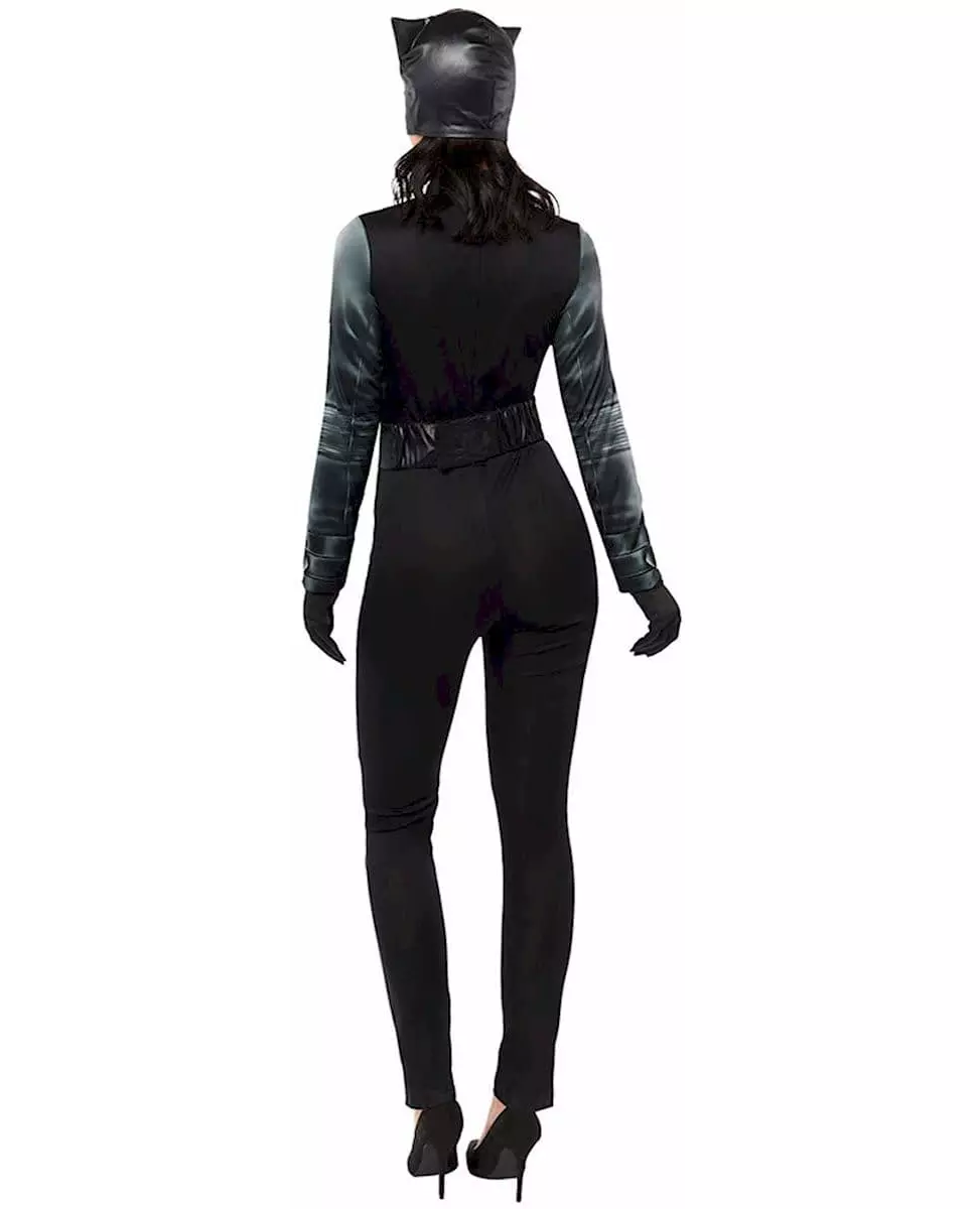 En kattedyr full av mystikk! Dette offisielt lisensierte Catwoman-kostymet inkluderer en svart jumpsuit, et belte og et hodeplagg. Den tettsittende jumpsuiten i skinneffektmateriale har elegante detaljer som minner om utseendet til den berømte innbruddstyven. Det svarte beltet med sølvspenne strukturerer anseelsen perfekt. Til slutt gir det svarte hodeplagget med katteører et kattepreg, ideelt for å legemliggjøre denne mystiske karakteren. Dette kostymet er perfekt for en kostymefest, et temaarrangement eller karneval. Bli mørkets dronning på et blunk! Inkludert tilbehør: Jumpsuit Belte Hodeplagg Materiale: 100 % polyester Vedlikehold: Håndvask