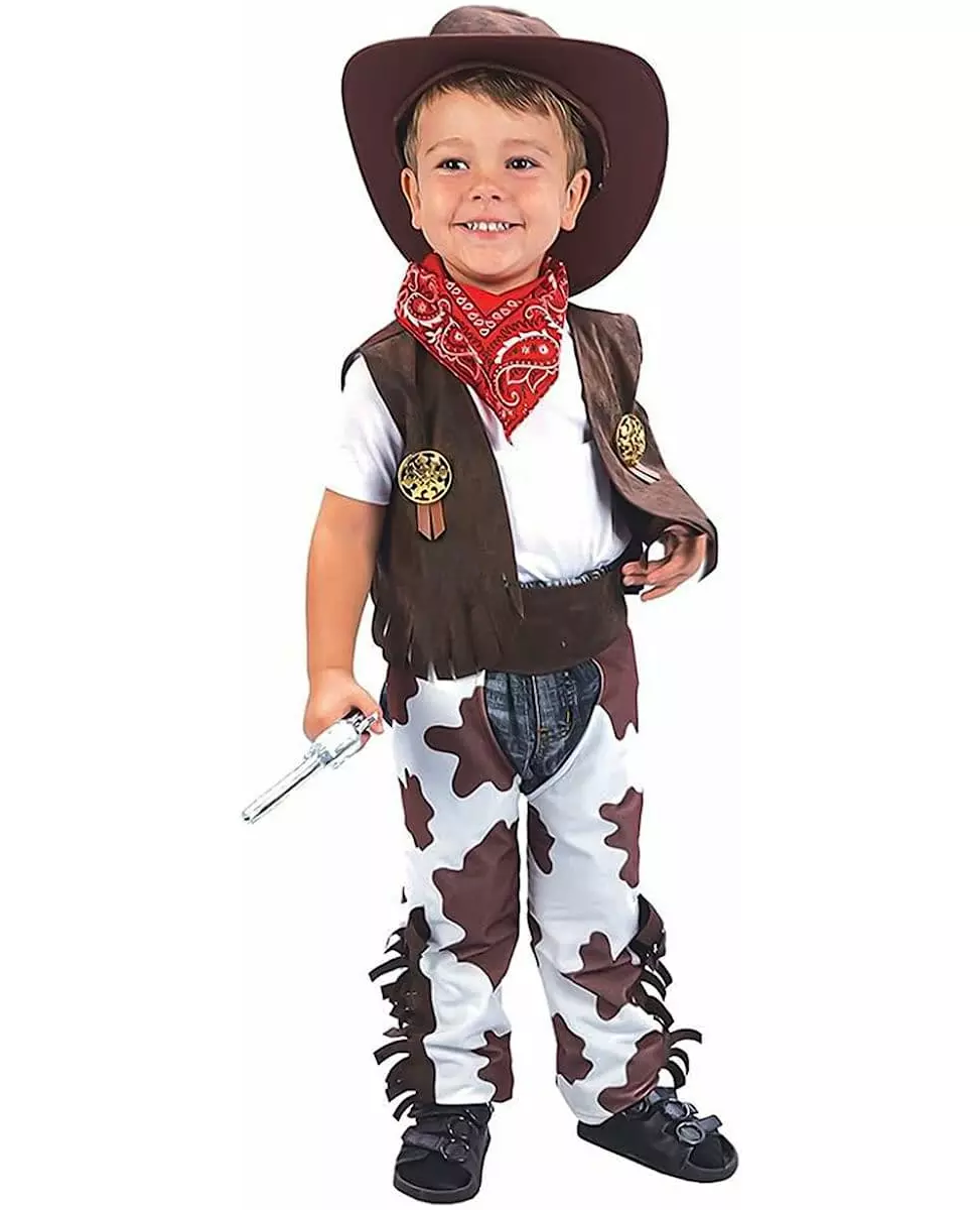 Bukser i imitert kuskinn! Dette cowboykostymet for gutter består av en vest i imitert semsket skinn med små gullmerker og frynser. Kostymet inkluderer også en hatt, bukser i kuskinn og et rødt skjerf. Dette settet vil være perfekt for å gjøre barnet ditt til en ekte cowboy til karneval eller andre utkledningsarrangementer. Inkludert tilbehør: Skjerf, vest, bukser, hatt. Materiale: 100 % polyester. Vedlikehold: Håndvask.