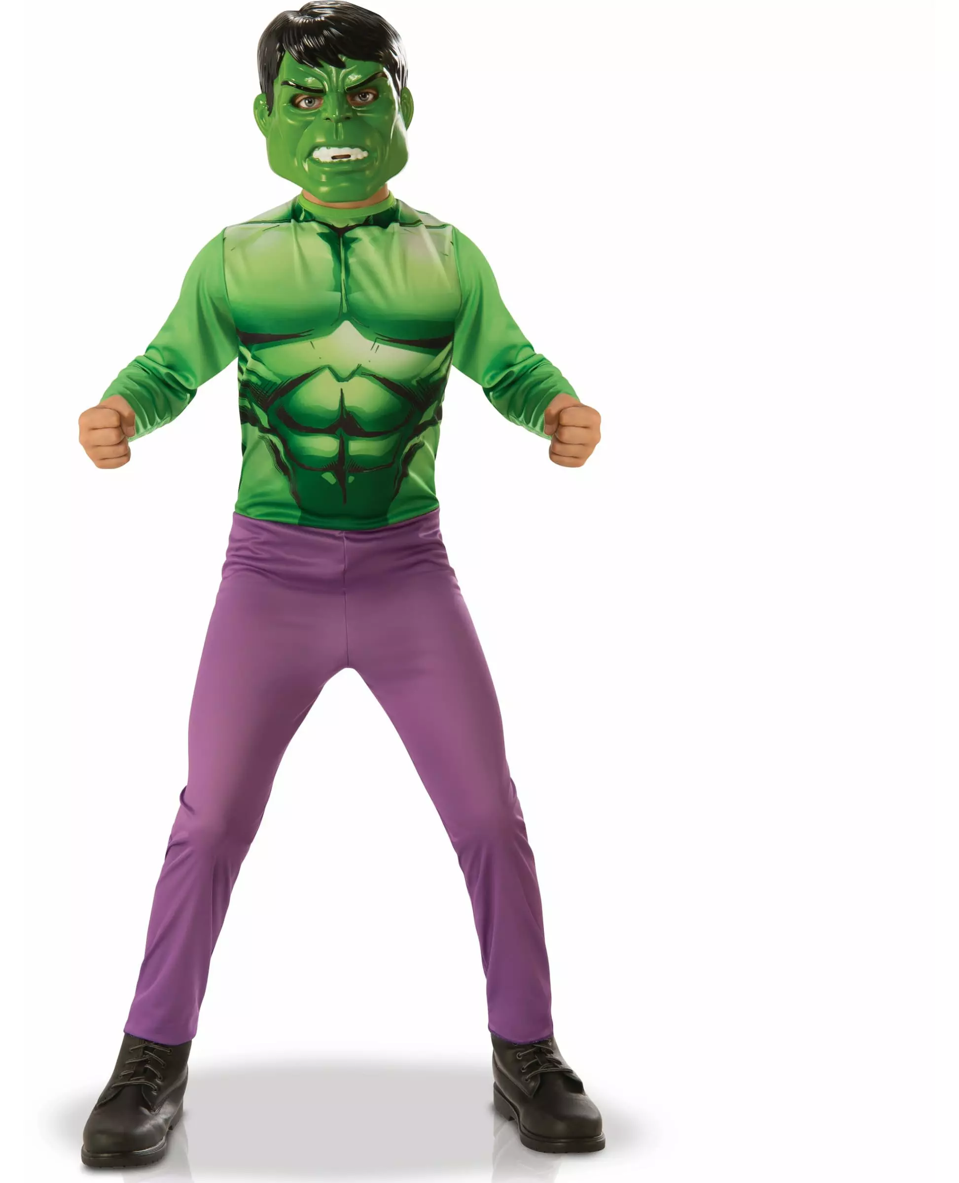 Angreen! Dette Hulk-kostymet for gutter er offisielt lisensiert av Marvel™. Det inneholder en jumpsuit trykt på torsoen og en halv PVC-maske. Jumpsuiten er lilla nederst for å representere Hulks ekstra store bukser. På torsoen er den trykt med den imponerende muskulaturen til denne superhelten som blir grønn når han blir sint! Masken er laget av grønn PVC. Den representerer ansiktet til denne mannen som forvandles til en grønn kjempe med sinne! For å sikre god passform er den utstyrt med elastiske stropper og et borrelåssystem. Dette Hulk-kostymet lar barnet ditt bli en superhelt til en Avengers™-tema bursdagsfest. Inkludert tilbehør: Jumpsuit Halvmaske Materiale: PVC, polyester Stell: Håndvask
