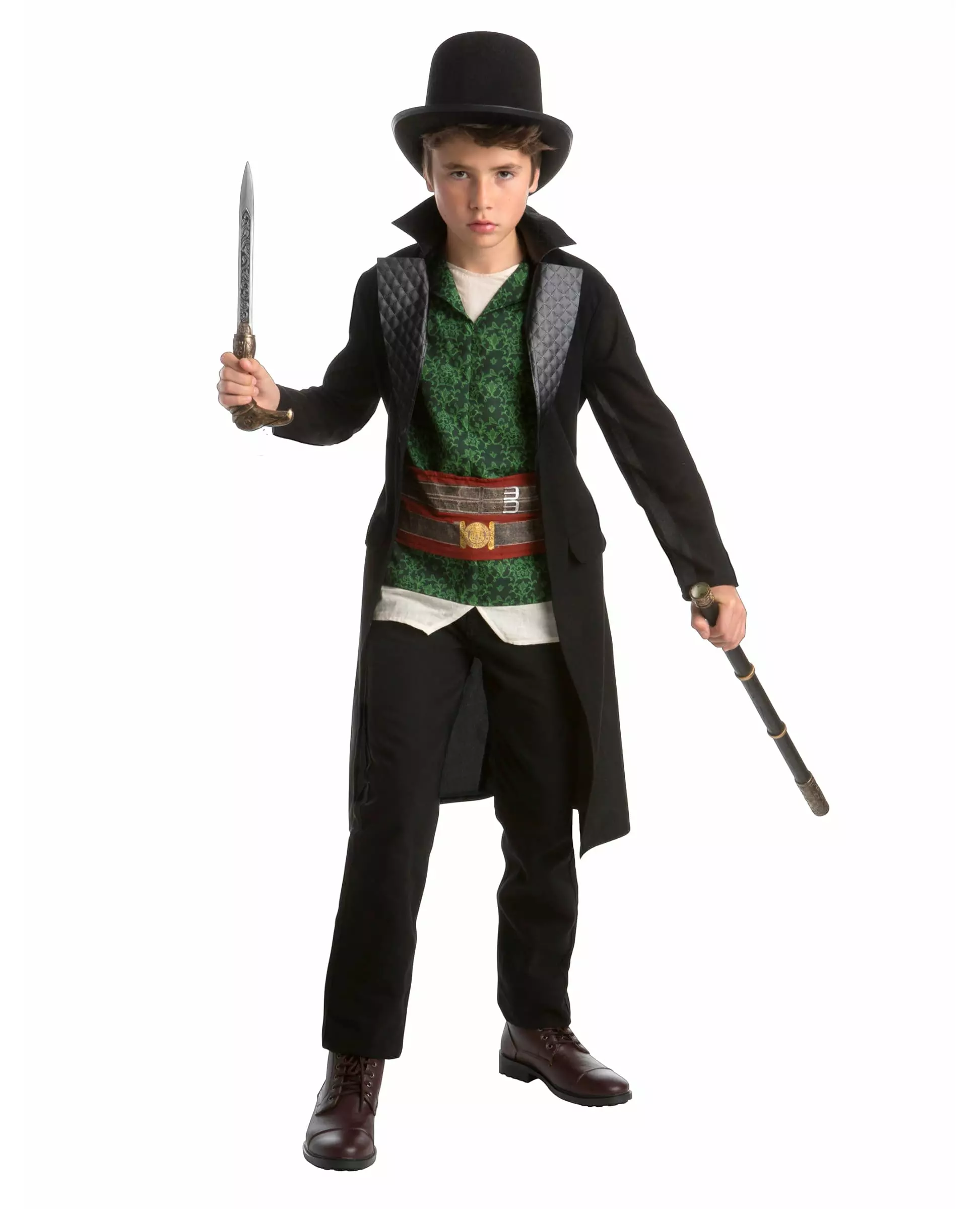 Gå inn i Jacobs sko! Dette Jacob-kostymet for tenåringer er offisielt lisensiert av Assassin's Creed™. Det består av en topp og bukser (hatt, våpen og sko er ikke inkludert). Toppen representerer en lang jakke med en topp sydd direkte på. Den lange jakken er svart med krageslag med skinneffekt. Den fuskede t-skjorten som er sydd på jakken, representerer en grønnmønstret vest over en kremfarget skjorte, med et belte i midjen. Denne toppen lukkes bak med borrelås. De svarte buksene er enkle og har elastikk i midjen. Dette kostymet vil være perfekt for å gli inn i huden til en av karakterene fra Assassin's Creed-sagaen. Inkludert tilbehør: Tunikabukser Materiale: 100 % polyester Målinformasjon: For en størrelse 12/14 år er brystmålet 96 cm. For en størrelse 12/14 år er bukselengden 98 cm