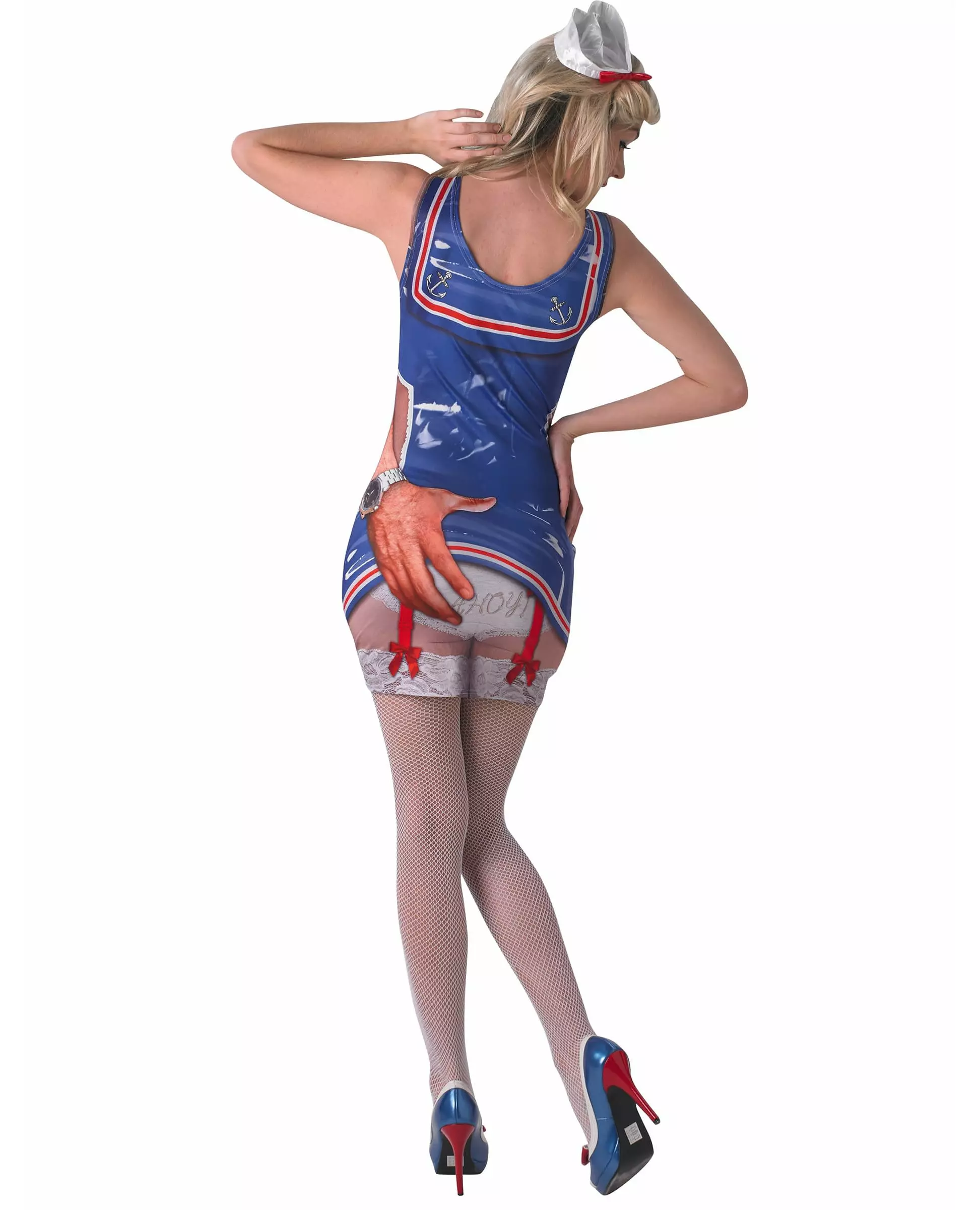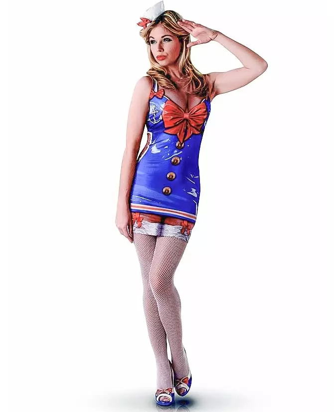 Bli med på et cruise for en kveld! Dette sexy sjømannskostymet for voksne inkluderer en kjole og en hatt (strømper og sko er ikke inkludert). Kjolen har V-hals og er fullt trykt med en sexy sjømannsuniform. Mange elementer av det nautiske temaet vises på stoffet, og på baksiden av kjolen er en mannshånd. Hatten er hvit og er dekorert med en liten rød sløyfe. Den er utstyrt med en brosje slik at du enkelt kan feste den i håret. Denne kjolen vil være perfekt for en fest med nautisk tema!. Inkludert tilbehør: Dresshatt Materiale: 100 % polyester Pleie: Håndvask
