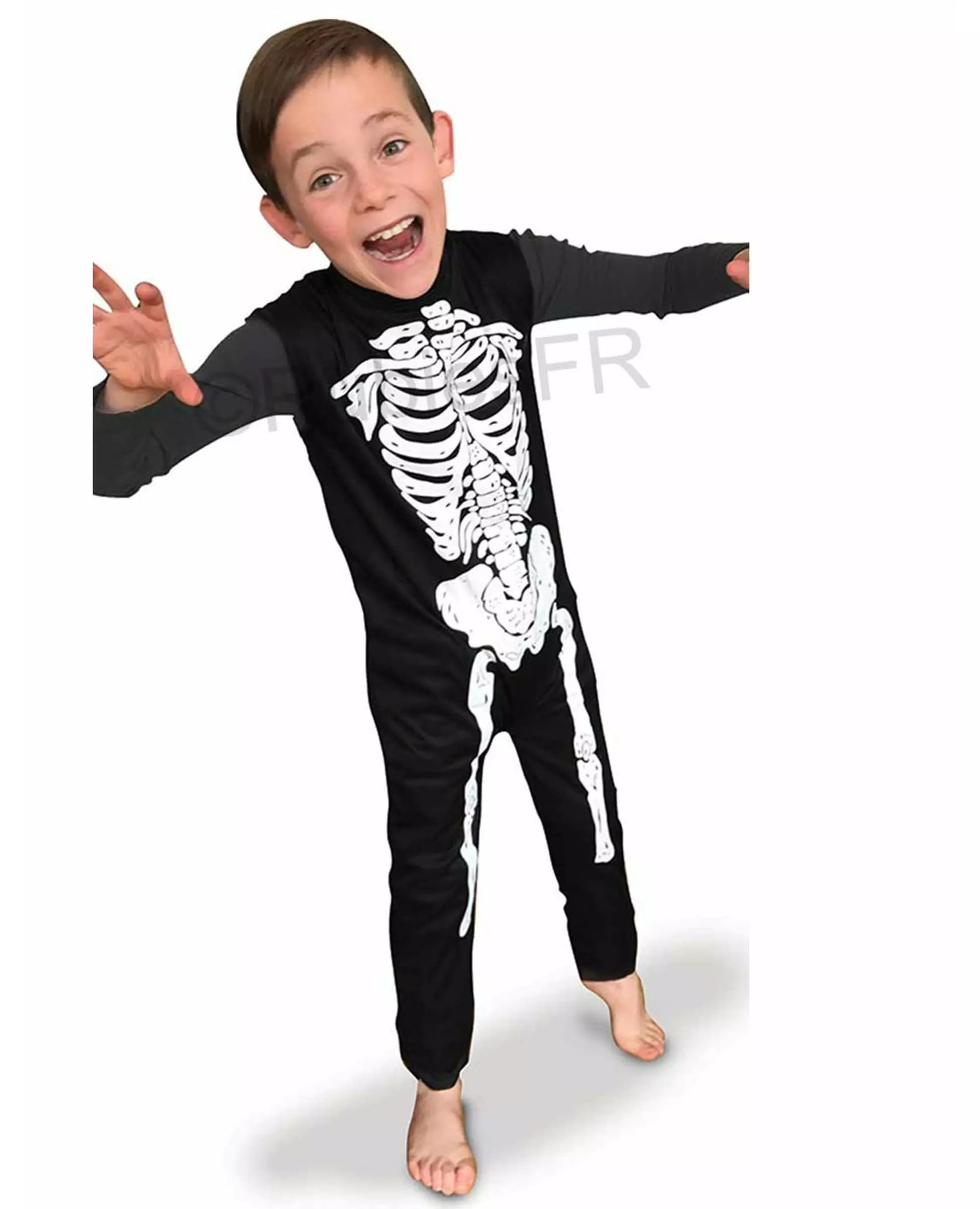En skjelett-jumpsuit til Halloween! Dette kostymet er for barn. Det består av en jumpsuit. Denne jumpsuiten er ermeløs og svart. Et hvitt skjelett er trykt på forsiden av jumpsuiten. Den vil være ideell for å forkle barnet ditt som et lite skjelett til Halloween!. Inkludert tilbehør: Ermeløs jumpsuit Materiale: 100 % polyester