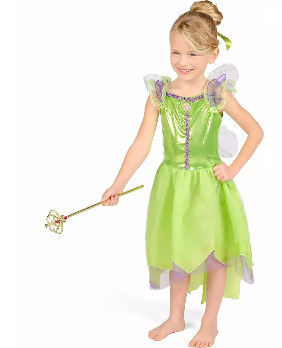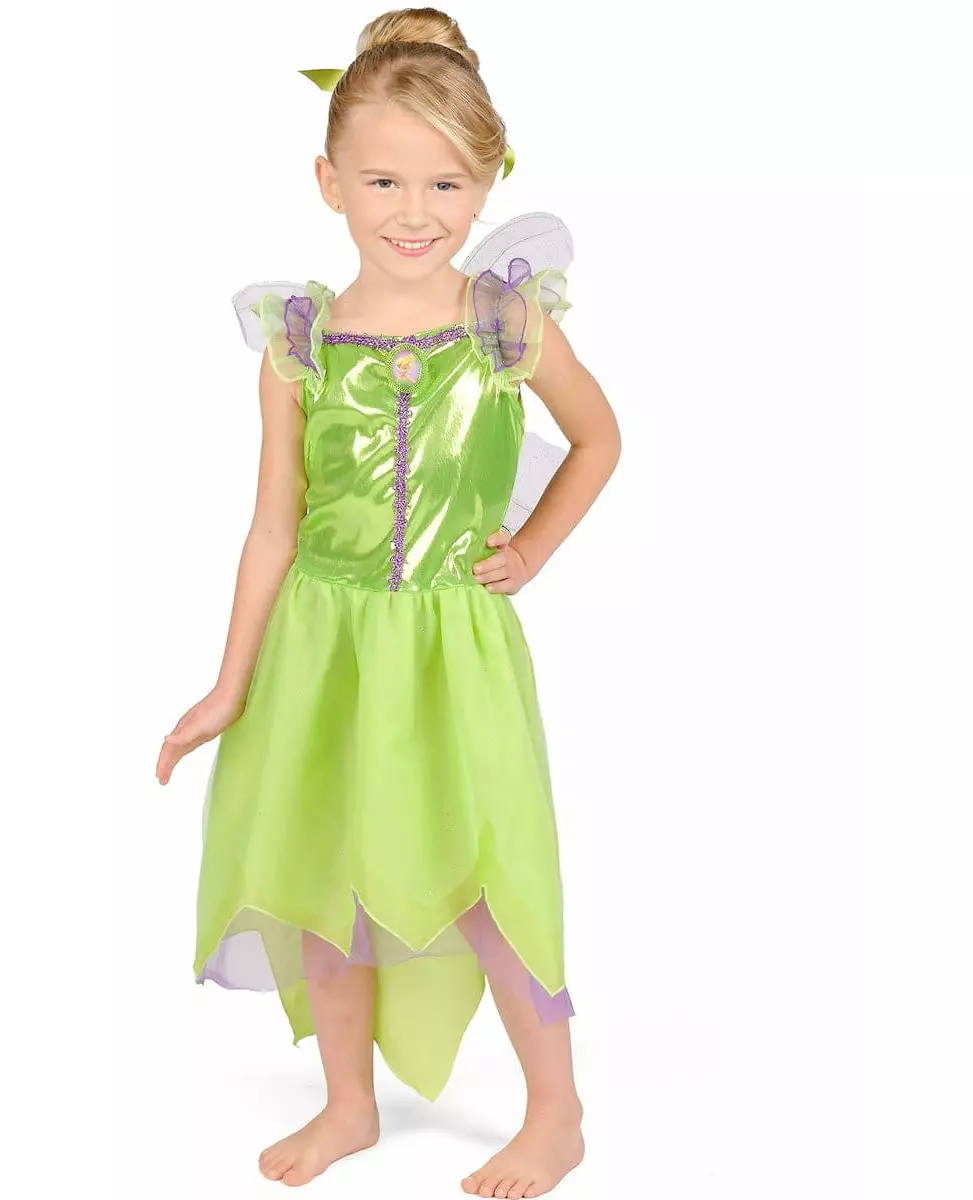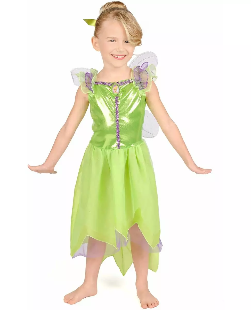 En praktfull fe til utkledningsarrangementet ditt! Dette Tingeling-kostymet for barn er offisielt lisensiert av Disney. Det inkluderer kun en kjole. Kostymet har ikke ermer. Det har stropper og er laget av grønt satengstoff for å fremheve den skinnende siden av kostymet. Nederdelen av kjolen er også bladgrønn og puffy. Du finner lilla nederst på kjolen, samt på toppen av kjolen på skuldrene og tyll. Til slutt vil portrettet av den berømte Tingeling være tilstede på kragen. Legemliggjør drømmefeen din til karneval eller nyttår med venner og familie! Inkludert tilbehør: 1 kjole Materiale: 100 % polyester Pleie: Håndvask