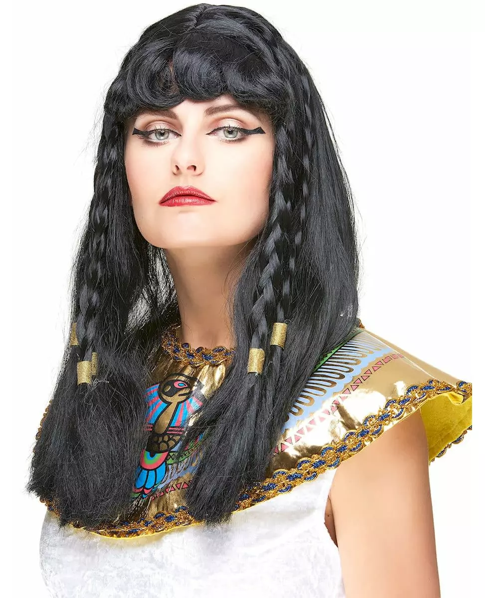 Overdådig! Denne praktfulle Kleopatra-parykken er for kvinner. Den er laget av langt, tykt, svart hår. Fletter er på sidene med gullfargede vedlegg. En kort lugg vil dekke pannen din. For å forandre ansiktet ditt til en kostymefest eller et show, vil denne svært estetiske parykken være ideell!. Inkludert tilbehør: Parykkmateriale: Syn 100 % polyetylen 100 % polyetylen