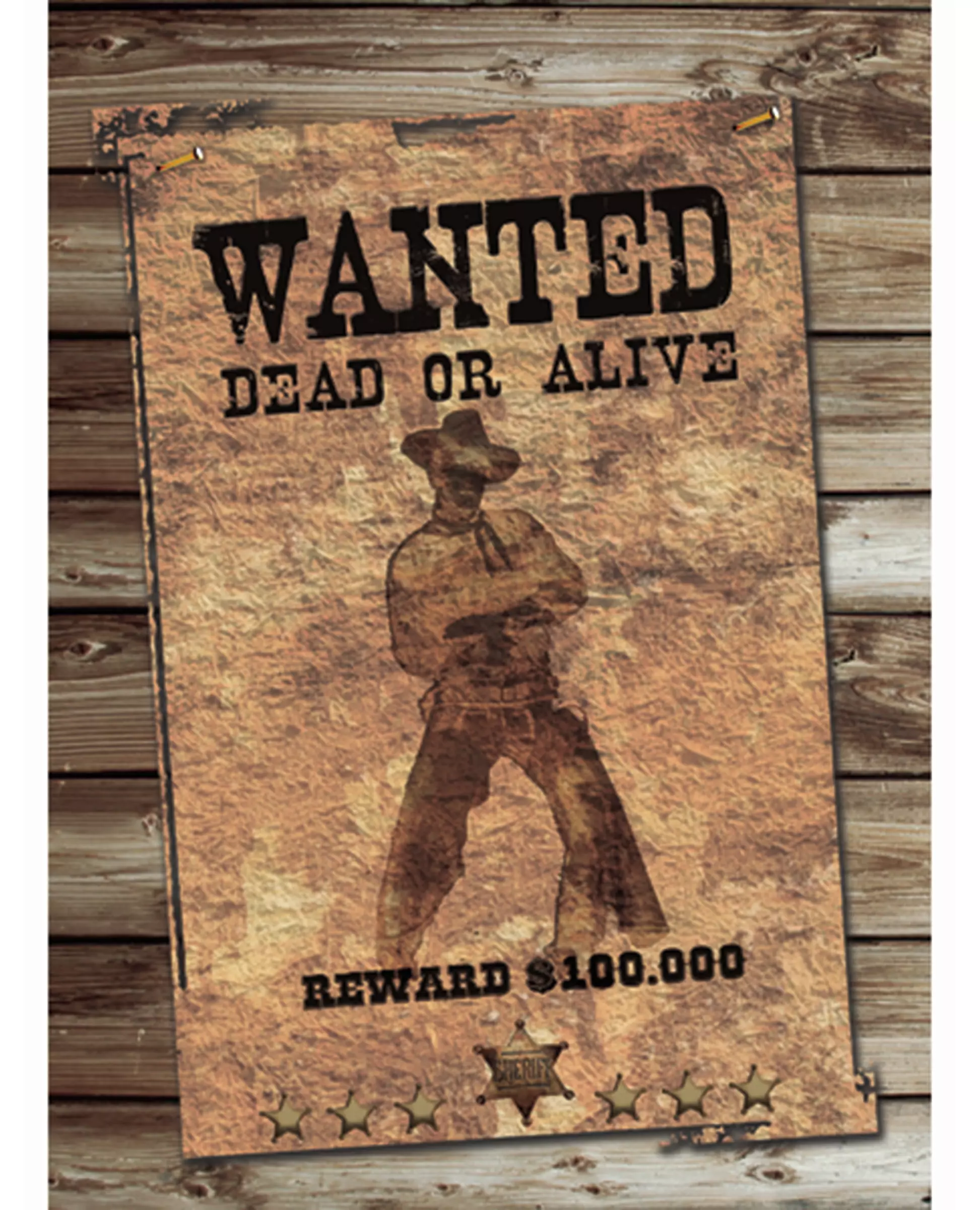 For en western-følelse! Denne veggdekorasjonen er rektangulær i formen. Den er 41,5 cm lang og 30 cm bred. På forsiden har den et trykk som forestiller en arrestasjonsplakat som henger på en trefasade. På denne plakaten er det en cowboy med våpenet sitt i midten og sheriffens stjerner nederst, samt inskripsjonene «Wanted», «Dead Or Alive» og «Reward $100,000». Denne dekorasjonen er laget av papp. Denne Wanted-dekorasjonen vil passe perfekt til dekorasjonen din under en western-tema-kveld eller under et kostymefest! Inkludert tilbehør: en veggdekorasjon Materiale: Papp