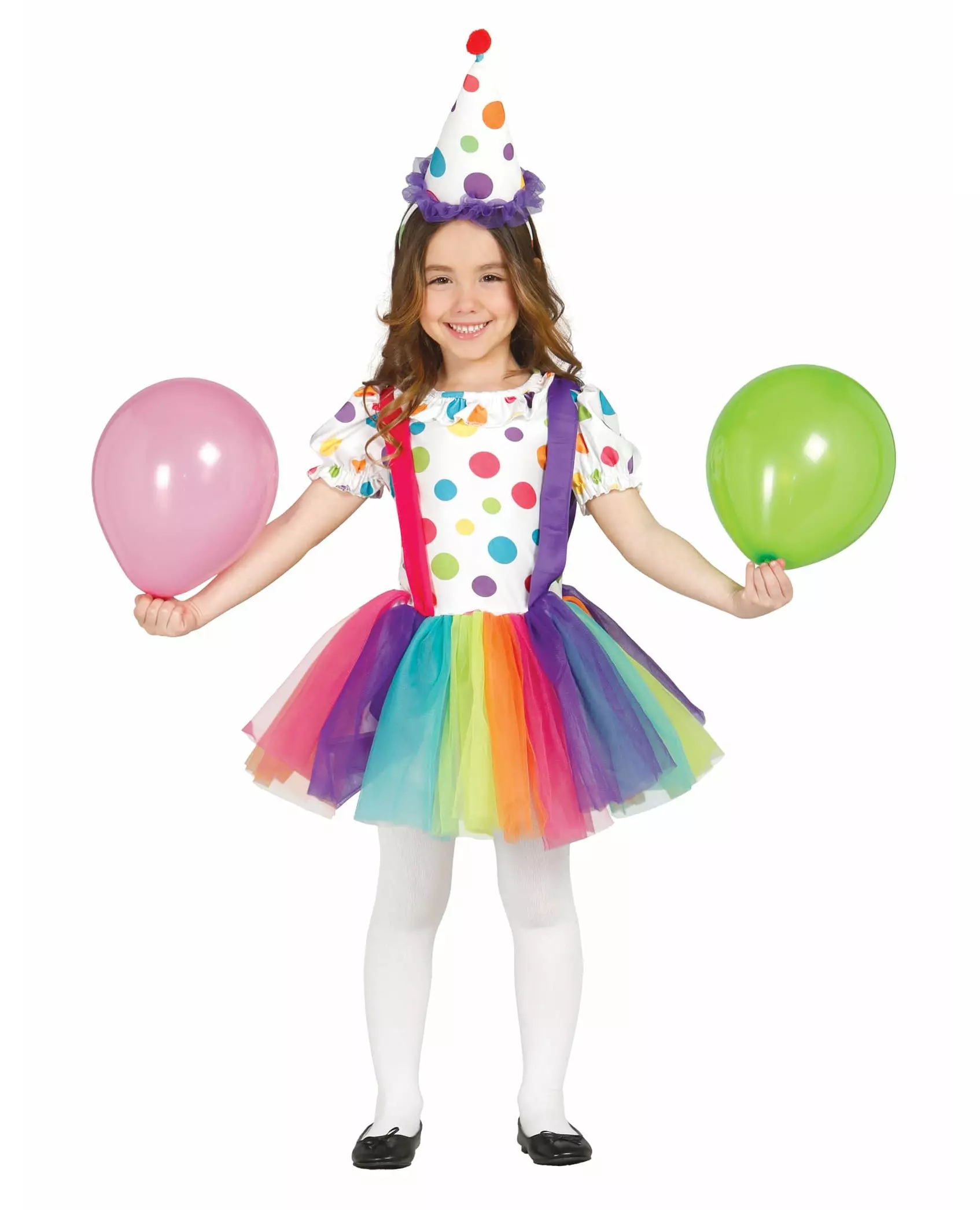 Farger og dill, du er uten tvil en skikkelig liten klovn! Dette klovnekostymet med polkadotter og tutu for jenter består av en kjole og et pannebånd (strømpebukser, ballonger og sko er ikke inkludert). Kjolen er hvit med fargerike prikker. Toppen av kjolen har to fargerike stropper og en krage. Stroppene er sydd og er ikke justerbare. De korte puffermene har strikk for bedre støtte. Nederdelen av kjolen er laget av flere strimler med fargerik tyll for en veldig festlig effekt! Kjolen lukkes bak med en ... Kjolen er festet med borrelås og har en strikk i midjen. Pannebåndet matcher kjolen. Det er dekket med hvitt stoff med fargerike prikker og er toppet med en klovnehatt laget av polstret stoff med samme mønstre. Et lilla tyllbånd nederst og en rød pompong i spissen fullfører hatten. Dette kostymet vil være ideelt for å forvandle datteren din til en pen liten fargerik klovn på karnevalet. Inkludert tilbehør: Kjolepannebånd Materiale: 100 % polyester Vedlikehold: Håndvask