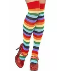 Originale og fargerike! Disse damestrømpestrømpene er stripete med regnbuens forskjellige farger. Deres preg minner om ull, slik at de blir helt ugjennomsiktige. Dette tilbehøret vil være ideelt for å fullføre klovnekostymet ditt under kostyme- eller temafester. Inkludert tilbehør: Et par strømpestrømper Materiale: 100 % polyester Pleie: Håndvask