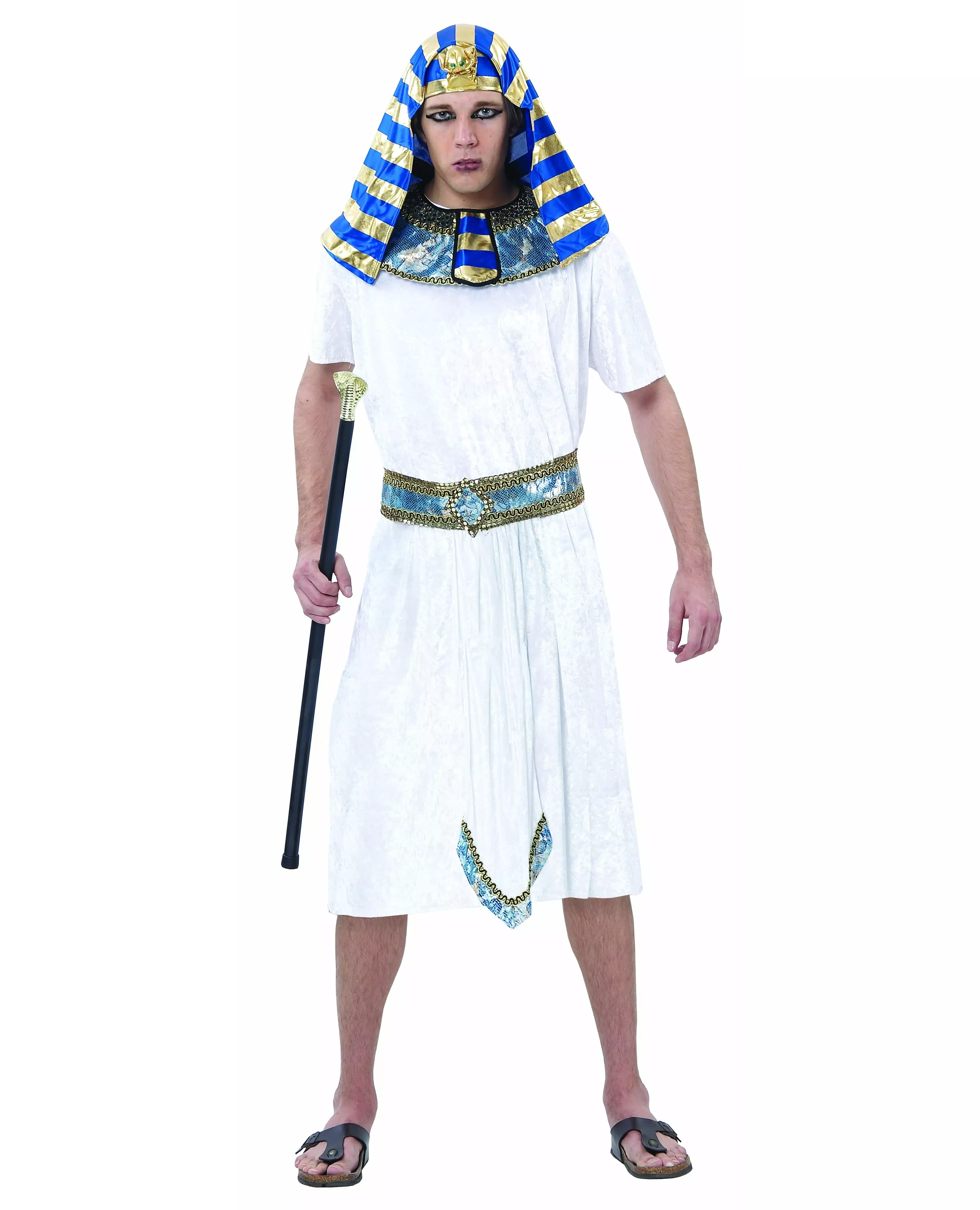 Hodeplagg inkludert! Dette faraokostymet for voksne inkluderer en tunika, et hodeplagg, en krage og et belte (septer ikke inkludert). Den lange tunikaen er hvit og fløyelslignende. Det kongelige hodeplagget har, i likhet med den berømte Tutankhamon, gull- og blå striper. Kragen og beltet som matcher hodeplagget, vil gi ditt egyptiske antrekk den siste touchen. Dette kostymet vil gi deg et kongelig utseende takket være finishen og den behagelige teksturen. Dette kostymet er ideelt for egyptiske fester eller andre utkledningsfester. Inkludert tilbehør: Tunika Hodeplagg Krage Belte Materiale: 100 % polyester Vedlikehold: Håndvask