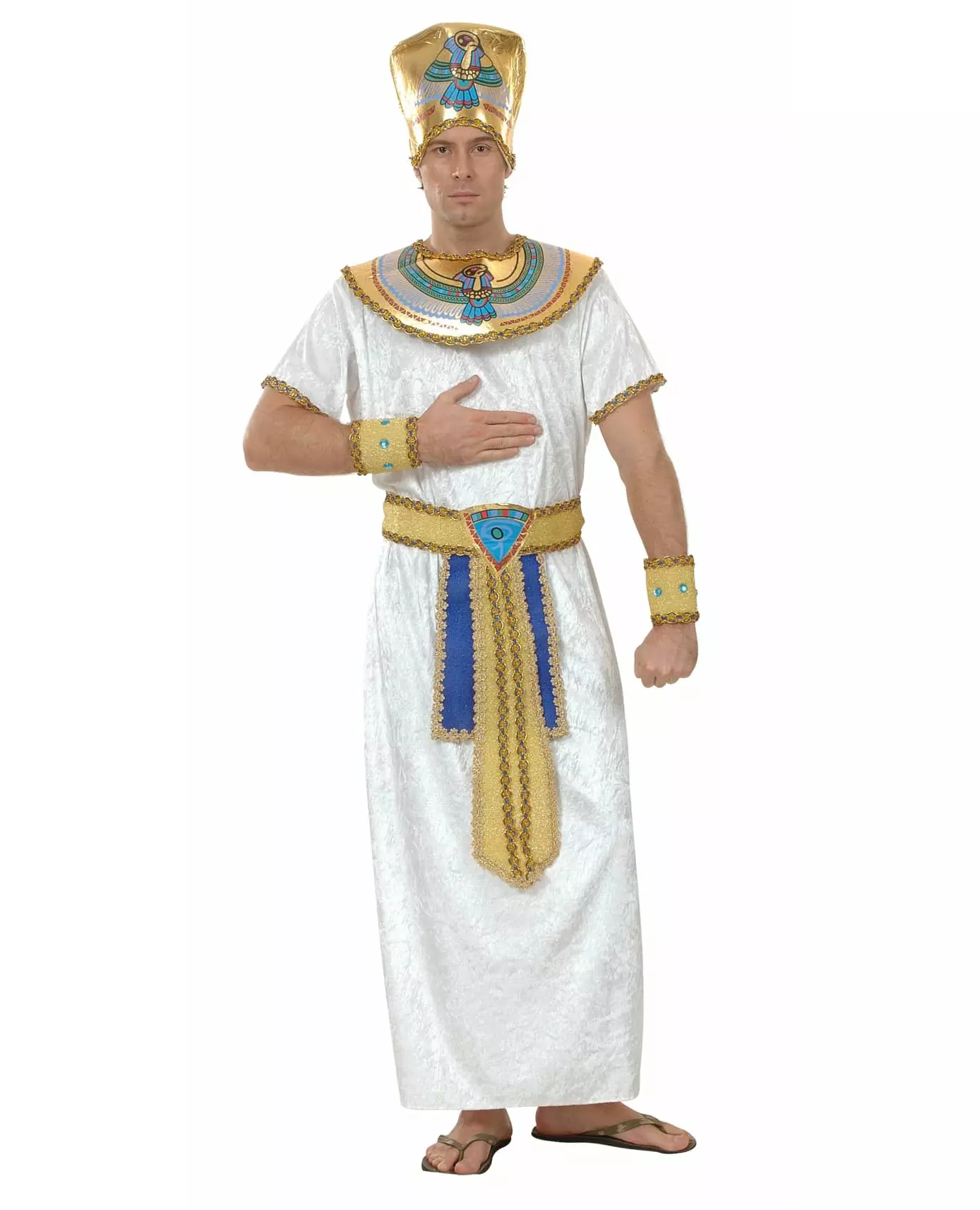 Hodeplagg med forseggjorte detaljer! Dette farao-kostymet for menn består av fem deler. (Septer og sandaler er ikke inkludert) En stor hvit kappe med fløyelsutseende som du kan justere med et belte. Dette beltet festes med borrelås bak. Et hodeplagg og en krage gir antrekket ditt en perfekt finish. De har et skinnende gullutseende og et design som minner om datidens hieroglyfiske skrift. Halsbåndet knytes bak. To ermer fullfører kostymet ditt og festes med borrelås. Dette kostymet er perfekt for å spille farao på karneval eller under egyptisk-tema kostymefester. Inkludert tilbehør: Hvit kjole Belte Hodeplagg Krage 2 ermer Materiale: 100 % polyester Vedlikehold: Håndvask