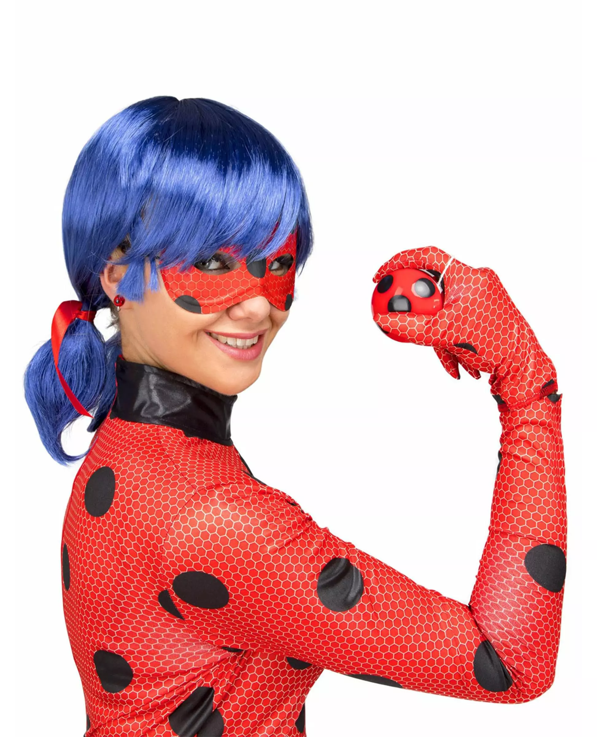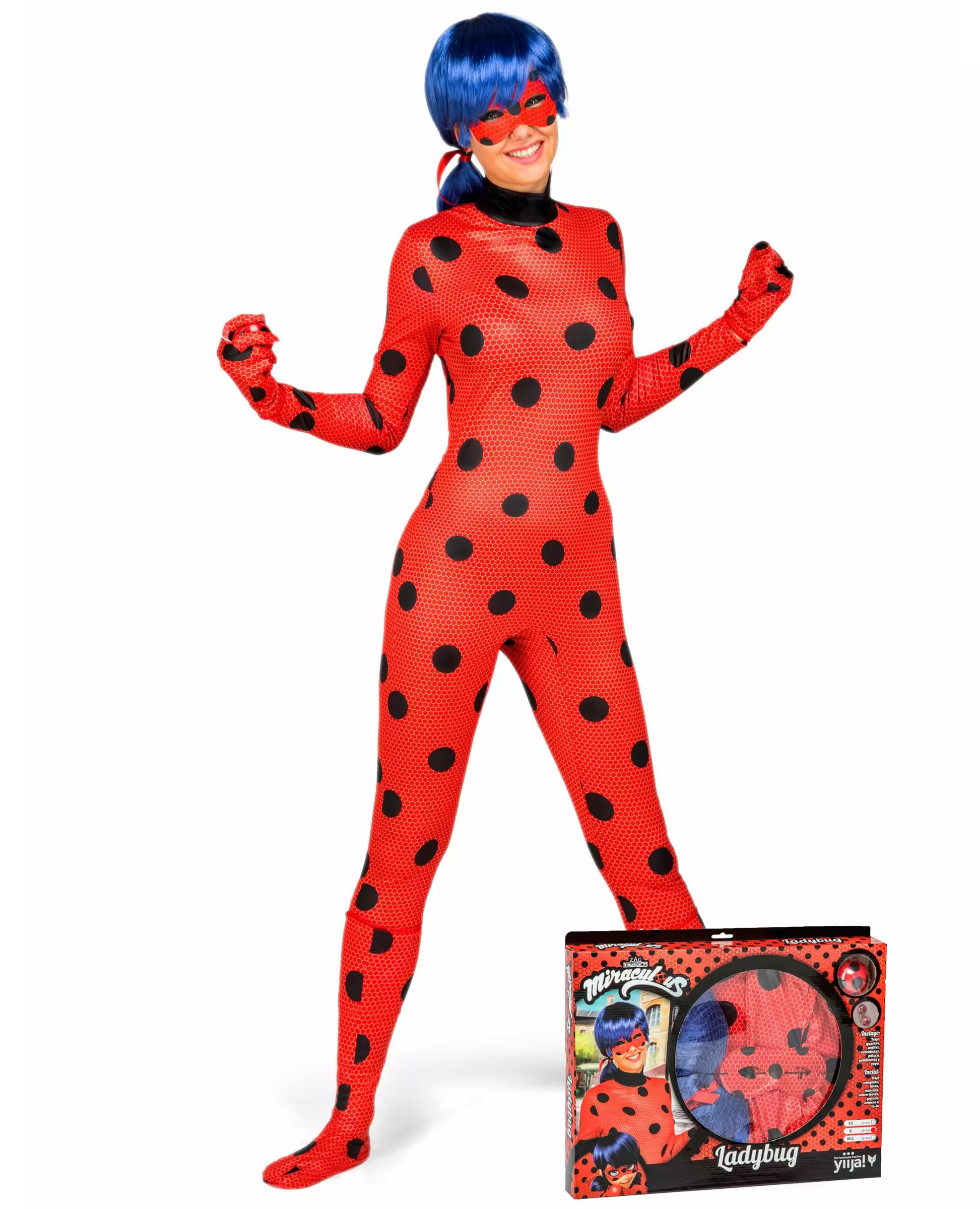 Se opp for onde sommerfugler! Dette offisielt lisensierte Mirakuløse Lady Bug-kostymet er for voksne og inkluderer en maske, hansker, en parykk, en jumpsuit, øredobber og en jojo. Den tettsittende jumpsuiten er rød med svarte prikker, i likhet med masken, hanskene, støveltrekket og jojoen. Den glir på og lukkes bak med glidelås. En blå parykk med to lave musefletter fullfører antrekket, sammen med øredobber. Med dette komplette kostymet kan du legemliggjøre barnets favorittheltinne under karnevalet. Inkludert tilbehør: 1 maske 1 par hansker 2 støveltrekk 1 parykk 1 jumpsuit 2 øredobber 1 jojo Materiale: 100 % polyester Vedlikehold: Håndvask