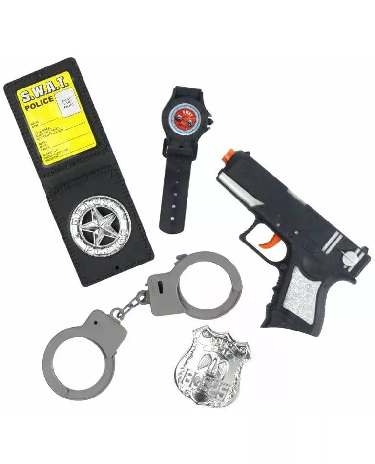 Gå etter bandittene med dette komplette politibetjentsettet. Dette politibetjentsettet for barn inneholder et merke, en pistol, et par håndjern, en klokke og et merke med registreringsnummer. Dette tilbehøret er laget av plast og er i svarte toner. Pistolen måler omtrent 13 cm lang, 2 cm bred og 9 cm høy. Dette svært komplette settet vil være essensielt for å spille en mer realistisk politibetjent under karneval eller en bursdagsfest. Inkludert tilbehør: Merke Pistol Håndjern Klokke Merke Materiale: Plast