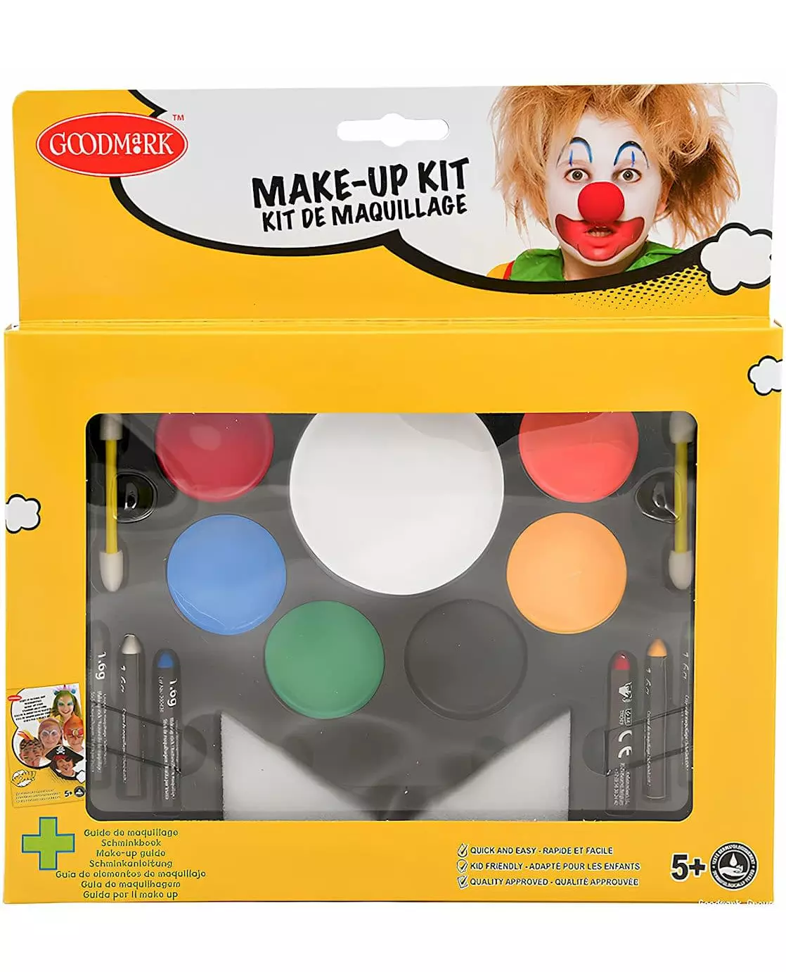 Materialer + veiledning følger med! Komplett sminkesett som inkluderer: 4,8 g hvitt, 1,8 g oransje, svart, gult, rødt, blått og grønt, 6 enkle fargeblyanter, 2 små børster, 2 små svamper og en veiledning. Sminke som er enkel å påføre og fjerne. Dette komplette settet er ideelt for å legemliggjøre enhver karakter, dyr eller annet under kostymefesten.