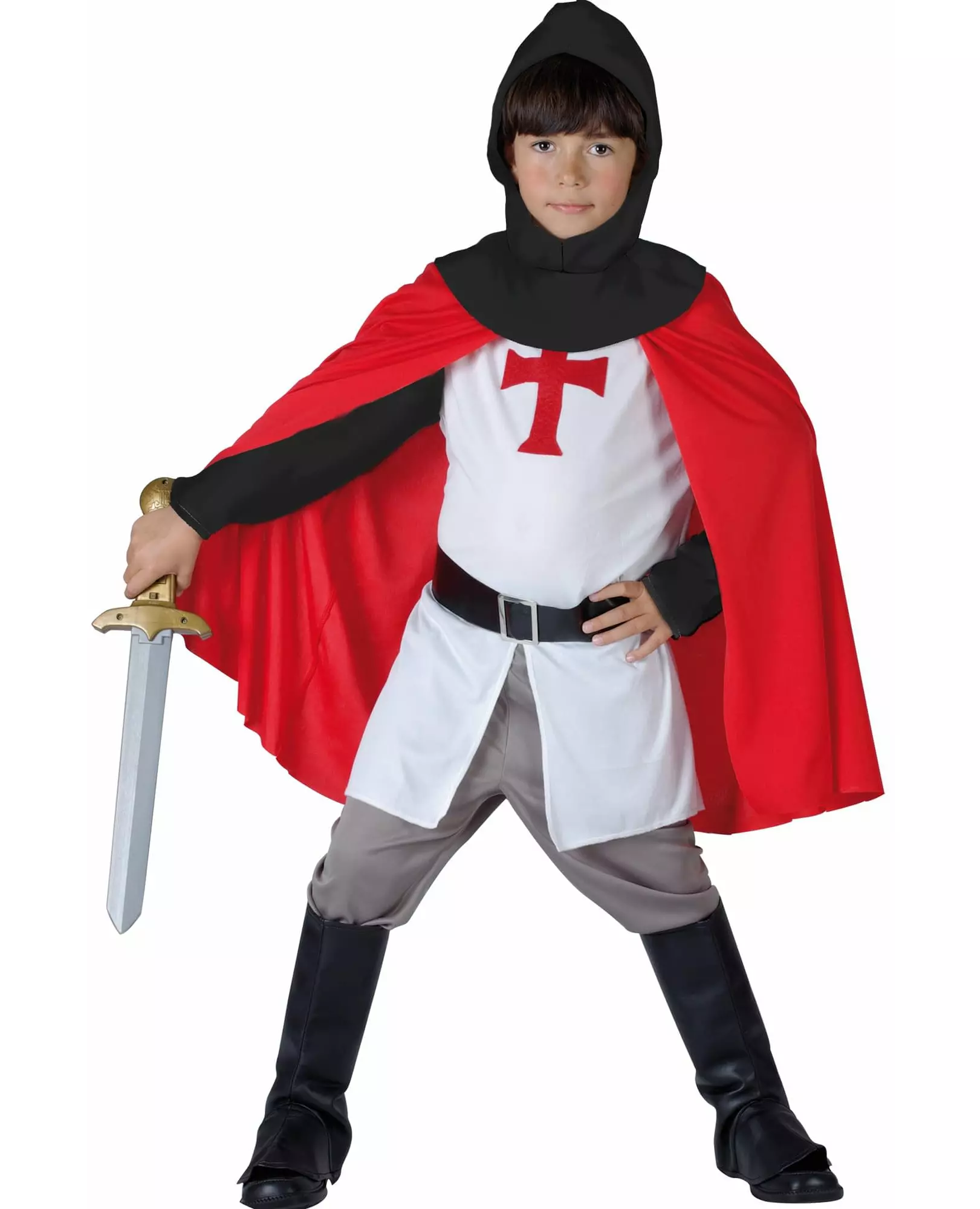 Bli en ekte middelalderridder! Dette ridderkostymet for gutter inkluderer en topp, en kappe, bukser, en hette, et belte og støveltrekk. Toppen er hvit og lang med et flokket rødt kors foran. Den røde kappen og den grå hetten festes med borrelås. Buksene er lysegrå og har en elastisk linning. Støveltrekkene er laget av tykt, skinnende svart stoff. Til slutt er beltet med en sølvfarget plastspenne festet med borrelås på baksiden. Dette svært komplette kostymet vil fordype barnet ditt i korstogenes tid, karnevalets tid. Tilbehør inkludert: Tunikabukser Hette Kappe Belte Støvletter Materiale: 100 % polyester Stell: For hånd