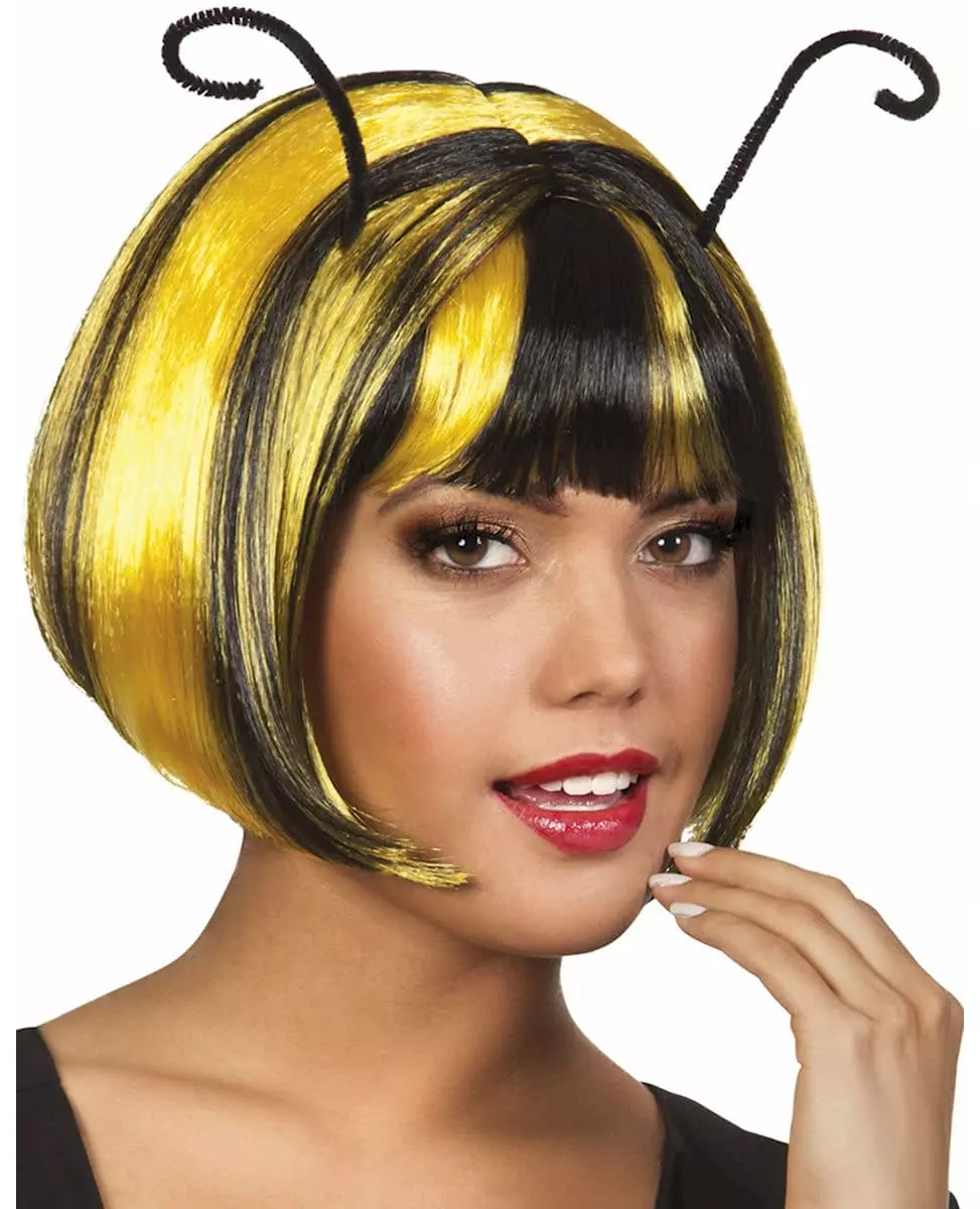 Buzz, Buzz! Denne parykken er for voksne. Laget av syntetisk hår, har den en kort, asymmetrisk klipp som er lengre foran. Håret er naturlig glatt og danner en lugg som dekker hele pannen og strukturerer ansiktet. Den er svart og gul i fargen og er stripete og ligner biekjolen, mens to antenner pryder toppen av parykken! Perfekt for å fullføre biekostymet ditt for en morsom og fargerik kveld!. Inkludert tilbehør: Parykk Materiale: Syntetisk 100 % polyester 100 % polyester