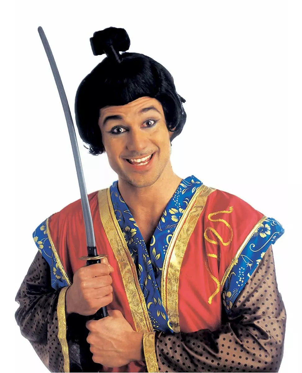 Bli en ekte samurai! Denne korte samurai-parykken for menn er svart og har en hestehale på toppen av hodet. Denne parykken er perfekt for å fullføre samurai-kostymet ditt til karneval eller utkledningsfester. Copyright Widmann SRL.