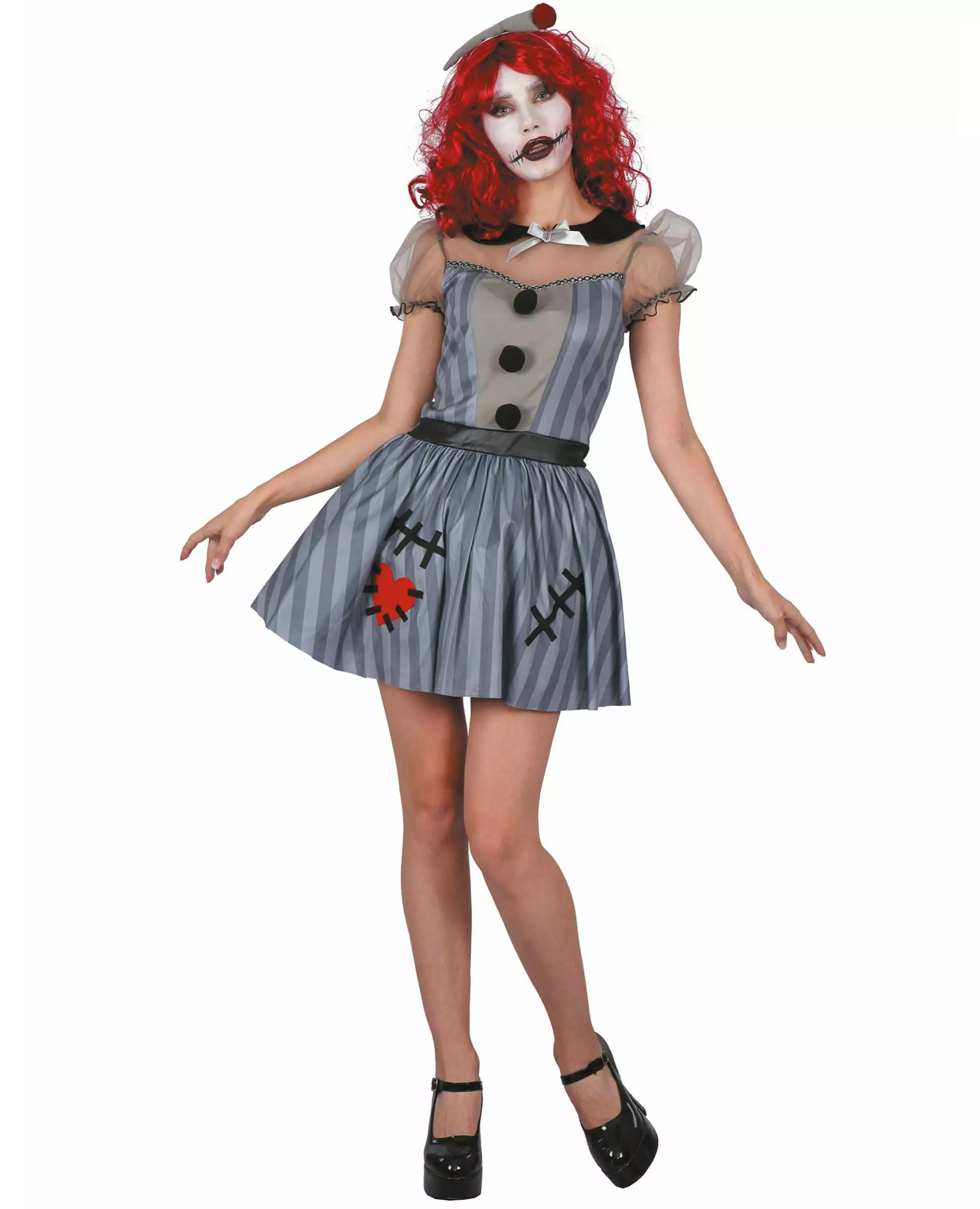 Forvandle deg til en gotisk dukke til Halloween! Dette påsydde dukkekostymet for kvinner består av en kjole og et pannebånd (sko ikke inkludert). Den korte kjolen har korte puffermer i grå voile. Peter Pan-kragen er svart med en grå sløyfe i midten. Kjolen er laget av grått stripete stoff. Imiterte stoffarr er sydd på undersiden av kjolen. Et pannebånd fullfører dette kostymet. Dette dukkekostymet vil være perfekt til Halloween-festen din. Inkludert tilbehør: Kjolepannebånd Materiale: 100 % polyester Pleie: Håndvask