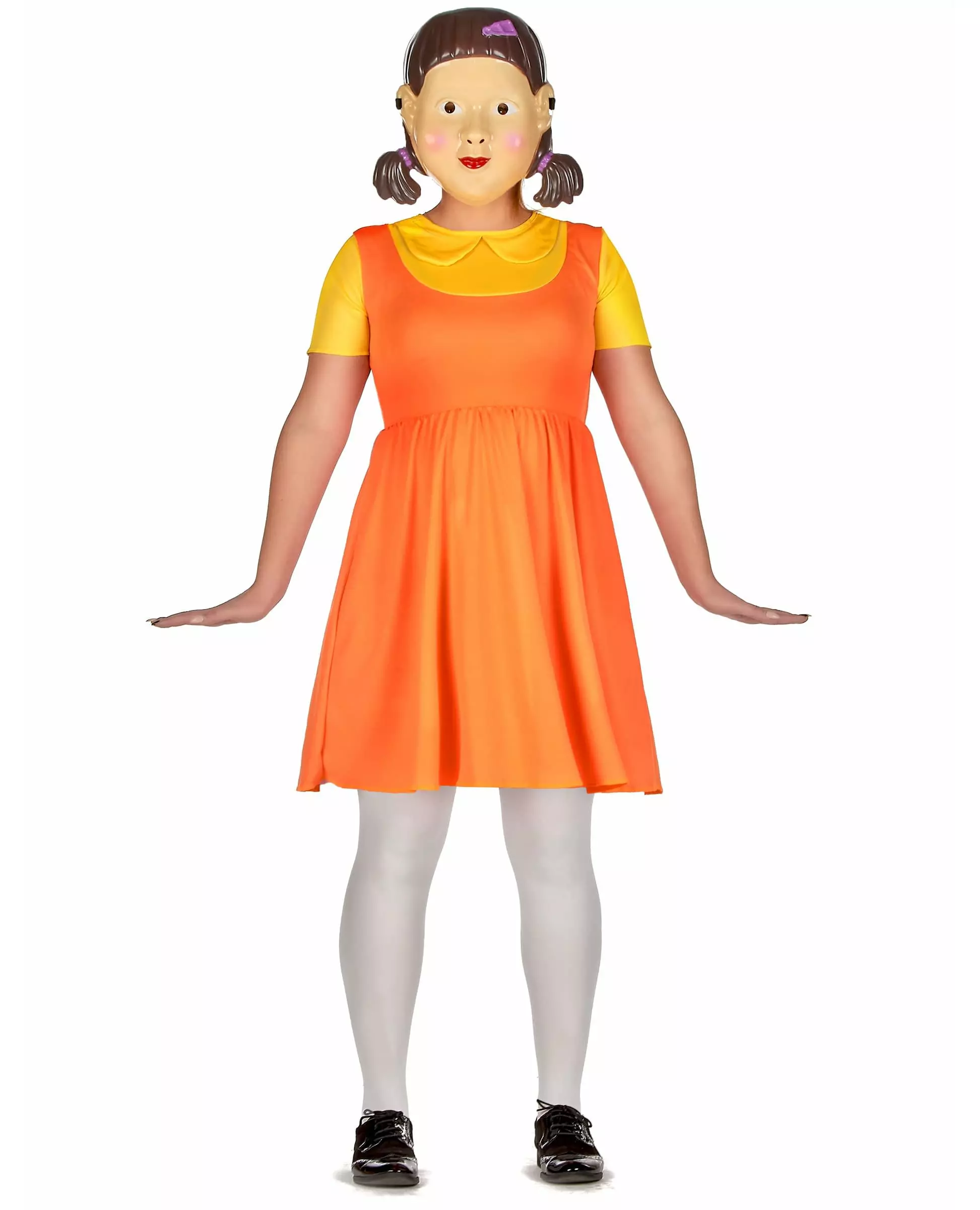 Ikke engang se på henne! Dette drapsdukkekostymet er for kvinner. Det inkluderer en kjole og et par sokker. Den mellomlange kjolen med korte ermer er oransje og gul. Den er dekorert med en gul krage. Sokkeparet er hvitt og matcher den berømte dukken fra den koreanske serien. Dette kostymet vil være ideelt for å fullføre et kostyme med temaet kjent serie til nyttår, karneval eller Halloween! Inkludert tilbehør: Dresssokker Materiale: 100 % polyester Pleie: Håndvask