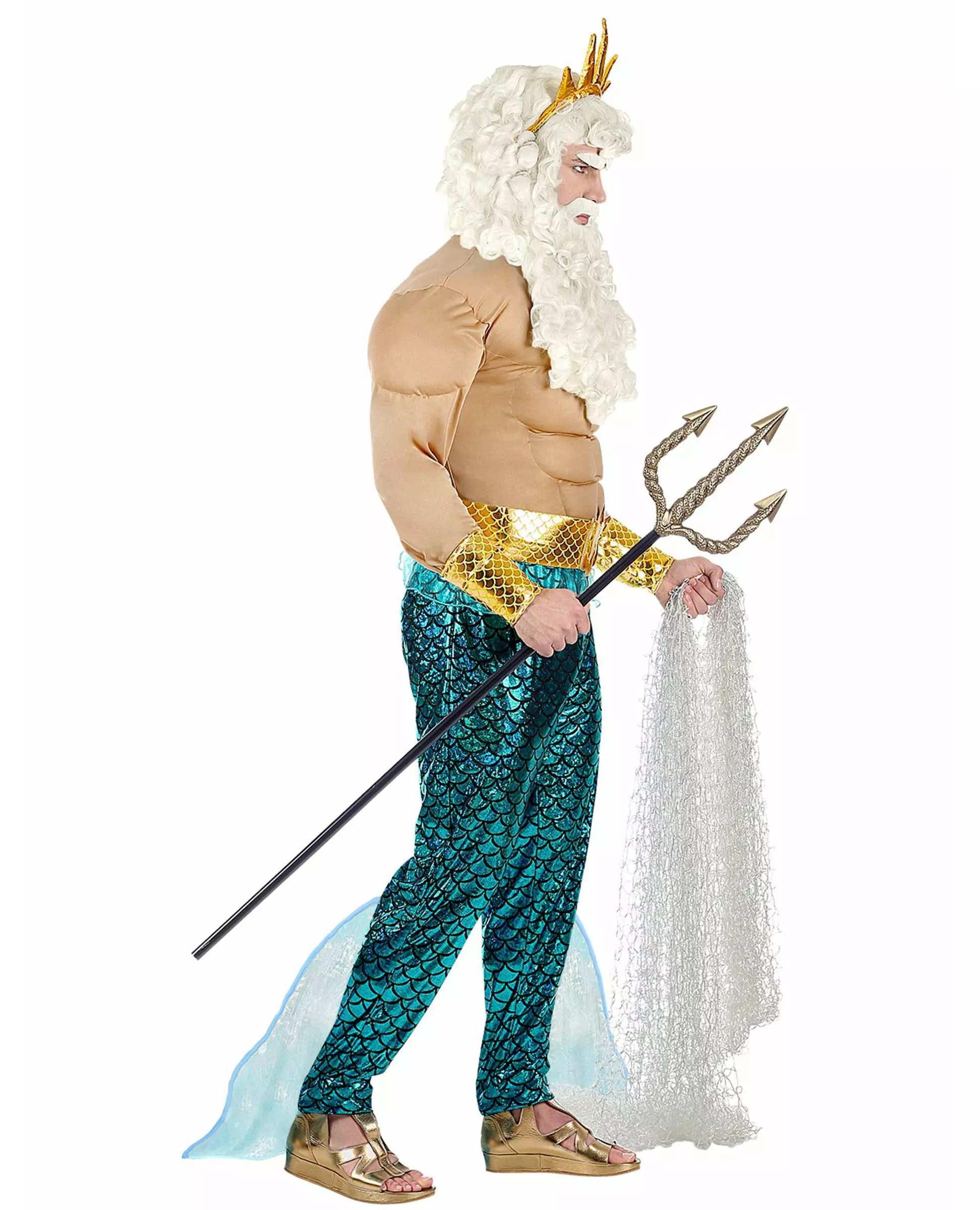 Bli den mest imponerende av havgudene! Dette havgudkostymet er for menn. Det består av en skjorte, bukser med belte, to armbånd og en krone (trfork, skjegg, hår og sko er ikke inkludert). Skjorten har en hudfarget overkropp foret med skum for å fremkalle formen til imponerende muskler. Denne toppen lukkes enkelt med borrelåsfester på baksiden. Gullfargede armbånd kan tres på etter toppen for å fullføre antrekket. Buksene med fiskeskjelltrykk er blå og har en metallisk glans. En gjennomsiktig blå tyll sydd på hver side av bena for å gi en havfrueeffekt vil perfeksjonere dette havgudkostymet. Den gylne kronen vil gi en realistisk side til forkledningen din. Dette havgudkostymet fra en berømt tegneserie vil være perfekt for ditt neste kostymefest!. Inkludert tilbehør: Topp Bukser med belte To armbånd Krone Materiale: 100 % polyester Vedlikehold: Håndvask