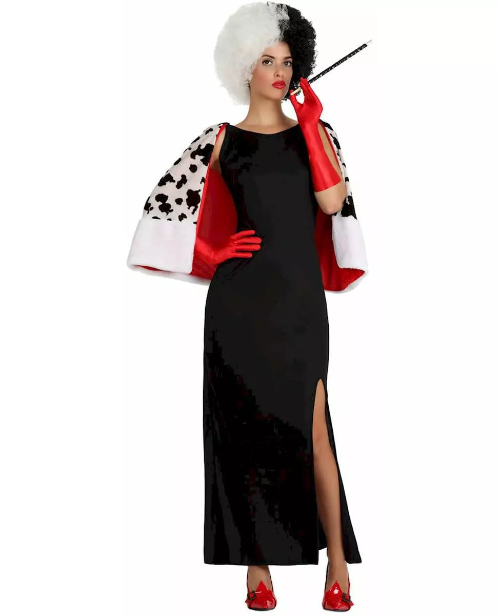 Grusomt elegant! Dette grusomme kvinnekostymet inkluderer en lang svart kjole og en kappe (parykk, hansker, sko og sigarettrør ikke inkludert). Kjolen er splittet over kneet og har elastisk midje, den justerer seg etter kroppens kurver. Den måler omtrent 140 cm og tas på over hodet uten lukking. Kappen festes med to borrelåsfester. Den er i svart og hvitt dyretrykk med et rødt foret interiør. Dette kostymet vil få deg til å føle deg grusom og utrolig elegant samtidig på en kostymefest eller til karneval. Inkludert tilbehør: Dresskappe Materiale: 100 % polyester Pleie: Håndvask