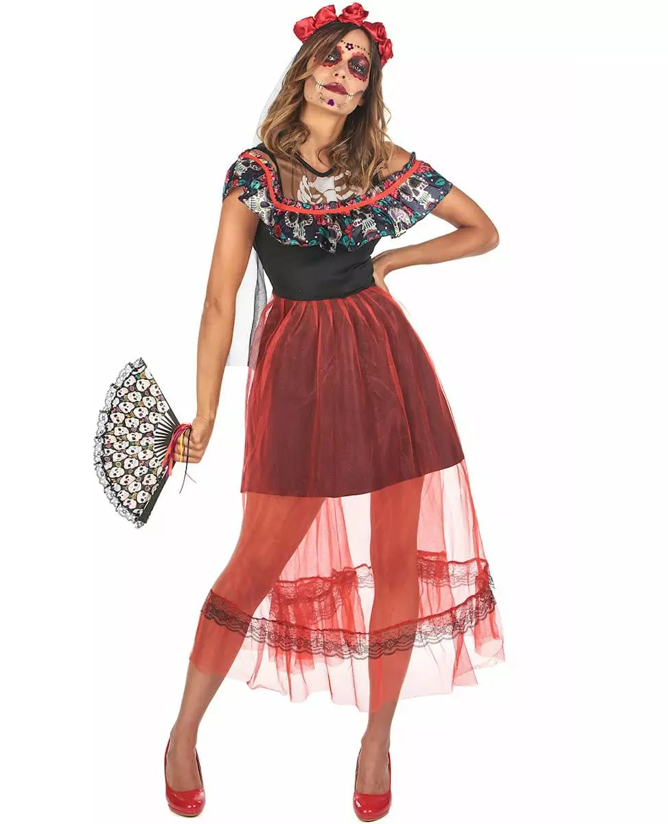 Velg et kostyme i fargene til De dødes dag! Dette Dia de los muertos-kostymet for kvinner består av en kjole og et hodeplagg. Kjolens topp er svart med en rysje trykt med blomster og hodeskaller. Halsutringningen er i svart slør med et hvitt skjelett. Kjolens nederste del er svart med et rødt slør-underskjørt over. Hodeplagget er et svart slør med falske røde blomster nederst. Dette Dia de los muertos-kostymet vil gjøre deg til den mest elegante på Halloween-festen din. Inkludert tilbehør: Kjole Hodeplagg Materiale: 100 % polyester Pleie: Håndvask