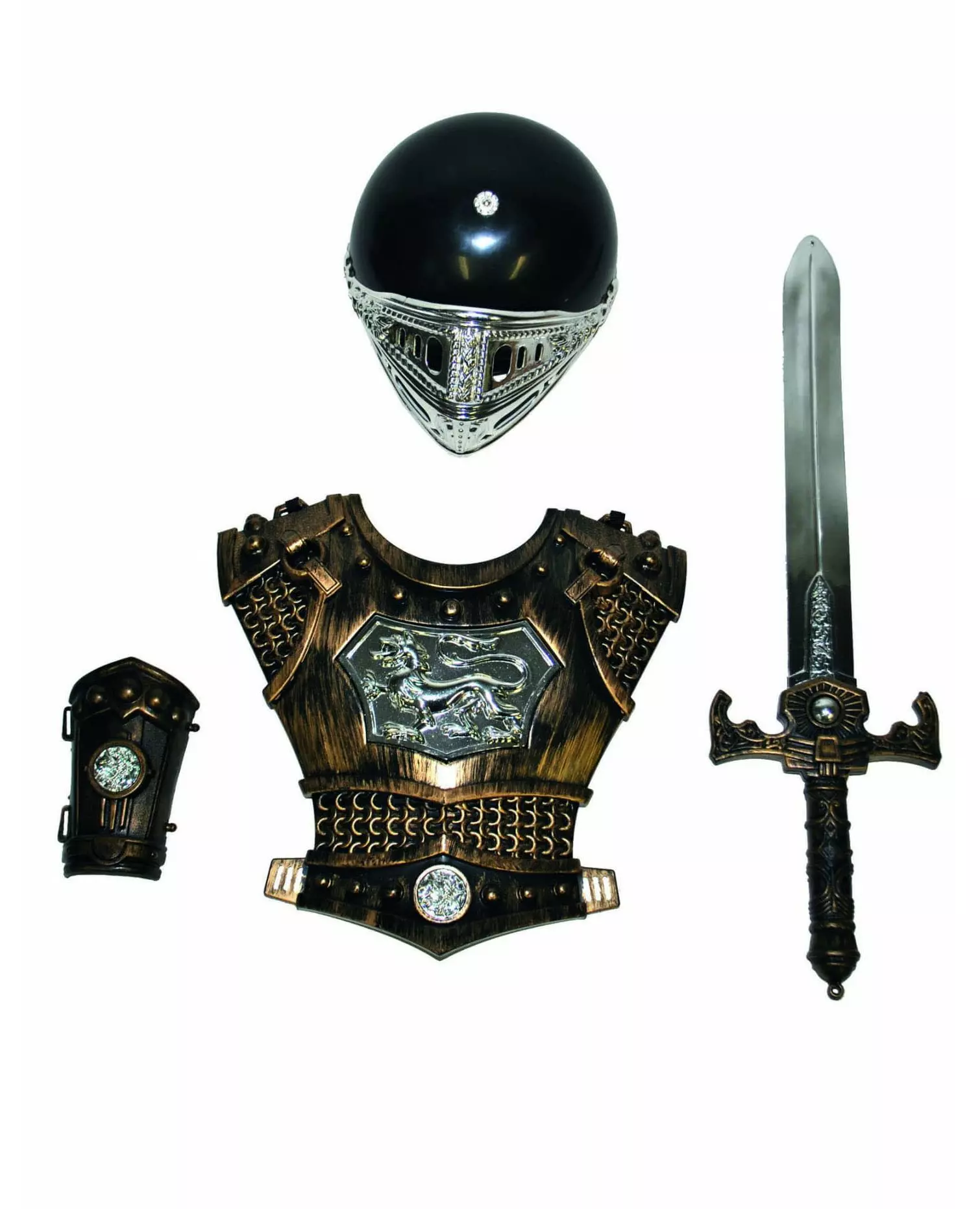 Barneridder-krigersett til våpen. Dette fantastiske riddersettet for barn inkluderer en hjelm, en brystplate med to ermer, et skjold og et sverd.