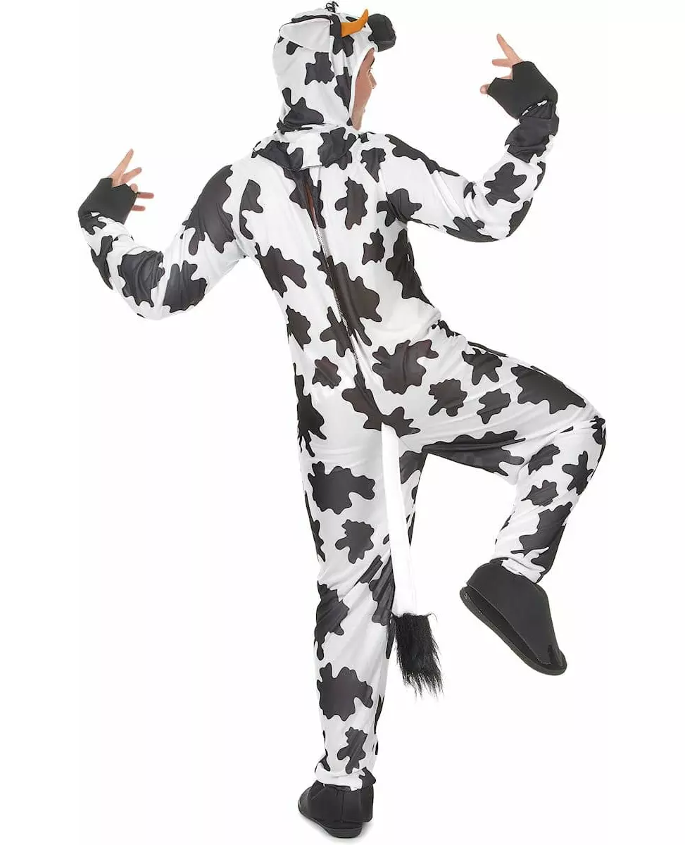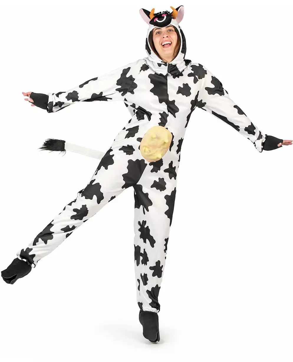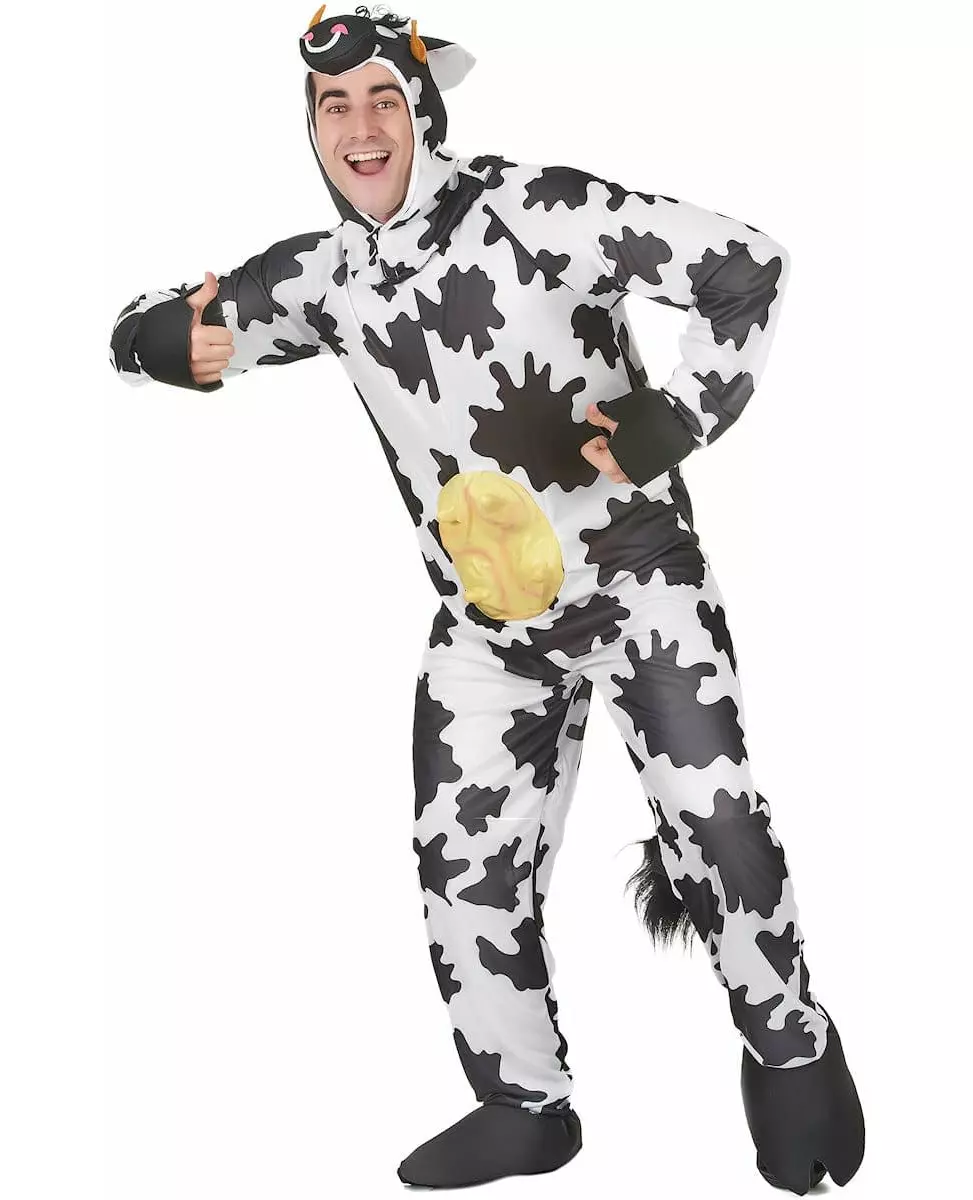 Jur på magen! Dette humoristiske ku-kostymet for voksne består av en jumpsuit og en hette. Den svarte jumpsuiten med hvite prikker er veldig luftig og behagelig å ha på seg. Kunstige svarte hover på endene av hender og føtter er sydd for ekstra realisme. Halen er hvit med en dusk syntetisk hår. Kunstige plastjur er sydd i midten, på magenivå. Kuas horn, ører, øyne og snute er sydd fast på hetten. Dette veldig humoristiske kostymet vil være ideelt for et utdrikningslag, et show eller et utkledningsfest. Inkludert tilbehør: Jumpsuit Hette Materiale: 100 % polyester Stell: For hånd