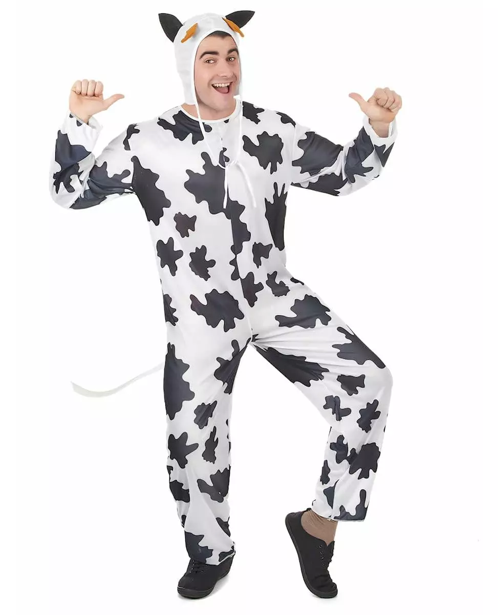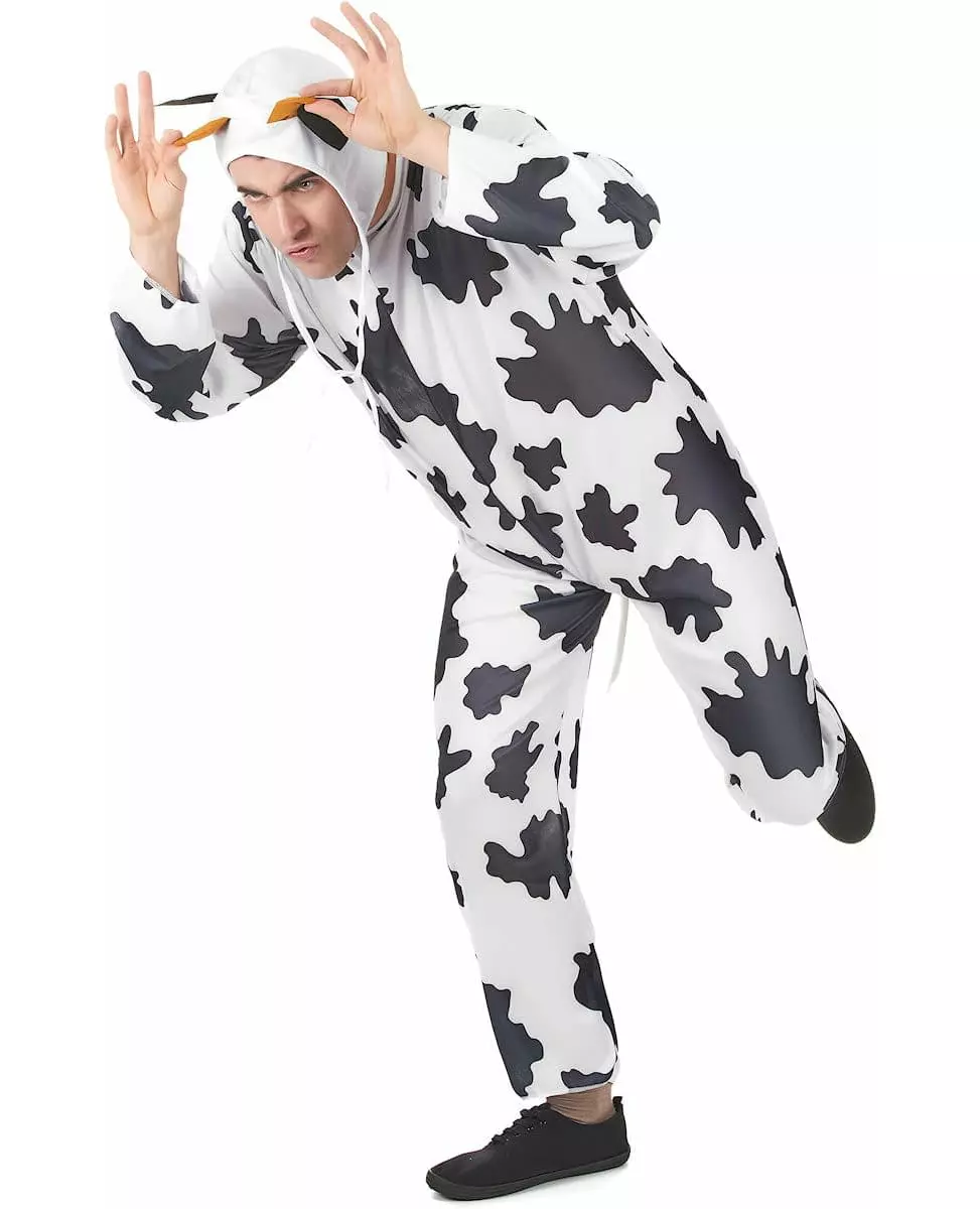 Å ku! Dette kukostymet er for voksne. Det består av en jumpsuit og en hatt. Jumpsuiten er hvit og svart med et kuskinntrykk og en hale bak. Den knytes med to knytebånd bak nakken. Hatten er hvit med svarte ører og små brune horn. Den knytes under haken med to knytebånd. Dette kostymet vil være perfekt til karneval, utdrikningslag eller kostymefest. Inkludert tilbehør: Jumpsuit-hatt Materiale: 100 % polyester Vedlikehold: Håndvask