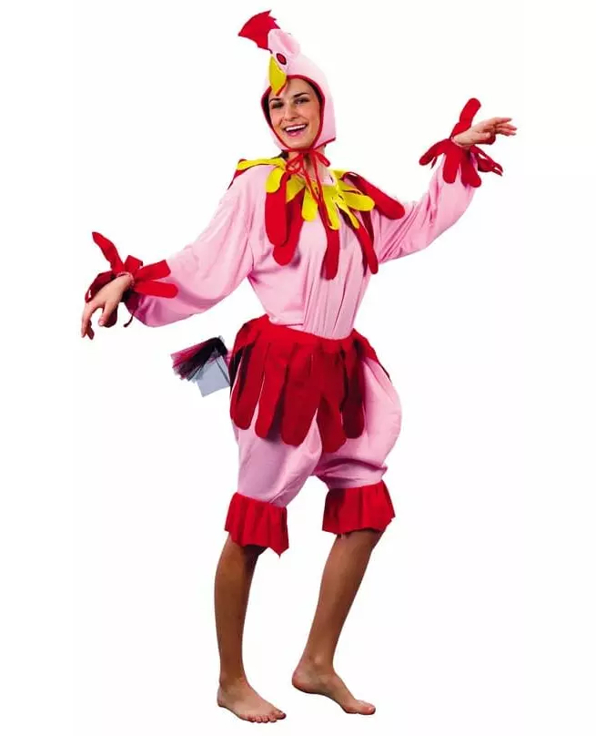 Skravl i et kyllingkostyme! Dette kyllingkostymet for voksne består av en topp, bukser og et hodeplagg. Den langermede toppen er rosa, med lange røde frynser og kortere gule rundt halsen. Endene av armene har også røde frynser. Disse finnes også på de rosa buksene, i hoftehøyde. Rødt stoff sydd ved kneet gir buksene et puffet utseende. Til slutt representerer hodeplagget hønens hode med det gule nebbet i midten, øyne på hver side og et våpenskjold øverst. Hetten knytes i halsen for bedre passform. For bedre effekt anbefaler vi å fylle buksene med skum eller stoff. Dette hønekostymet er perfekt for temafester! Inkludert tilbehør: Topp Bukser Hodeplagg Materiale: 100 % polyester Vedlikehold: Håndvask