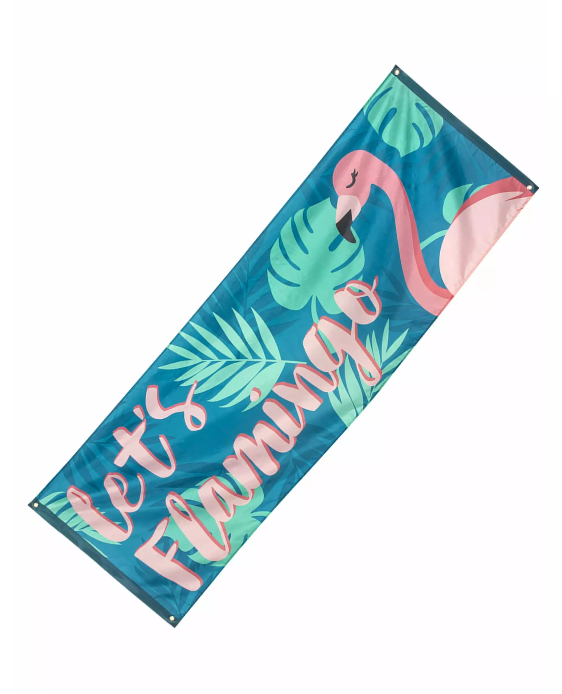 Et flamingobanner til en tropisk fest! Dette tropiske stoffbanneret måler omtrent 74 x 220 cm. Det er grønt og har tropiske bladmønstre, en flamingo og ordene «Let's Flamingo». Dekorer den tropiske festen din med dette supertrendy banneret! Inkludert tilbehør: 1 banner Materiale: Stoff