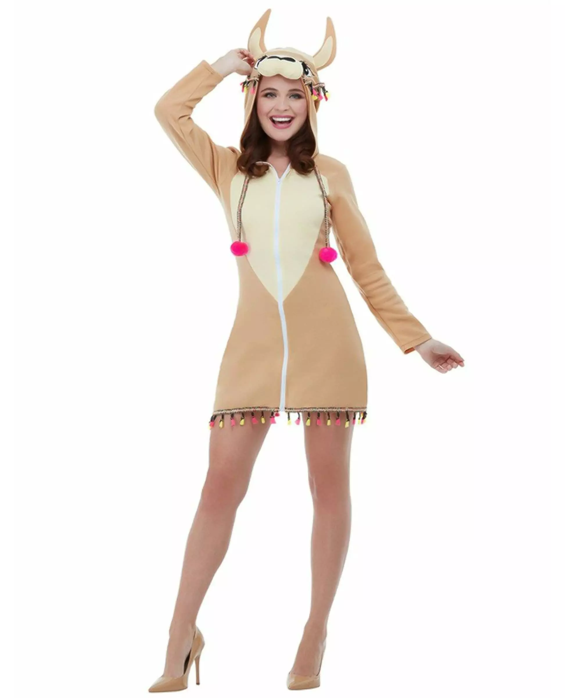 For fans av Latin-Amerika Dette lamakostymet for kvinner inkluderer en kjole med hette. Den tettsittende kjolen er kort. Den er laget av beige stoff med en lysere mage. En hvit glidelås lar deg åpne og lukke den uten problemer. Kjolen har en hette. Den er toppet med en hette med et lamahode. Hetten har snorer med pene rosa pomponger. Nederdelen av kjolen er også dekorert med en kant og gule og rosa pomponger. En hale er også sydd på baksiden av kjolen. Dette lamakostymet for kvinner vil være perfekt for en fest med dyretema. Inkludert tilbehør: Kjole med hette Materiale: 100 % polyester