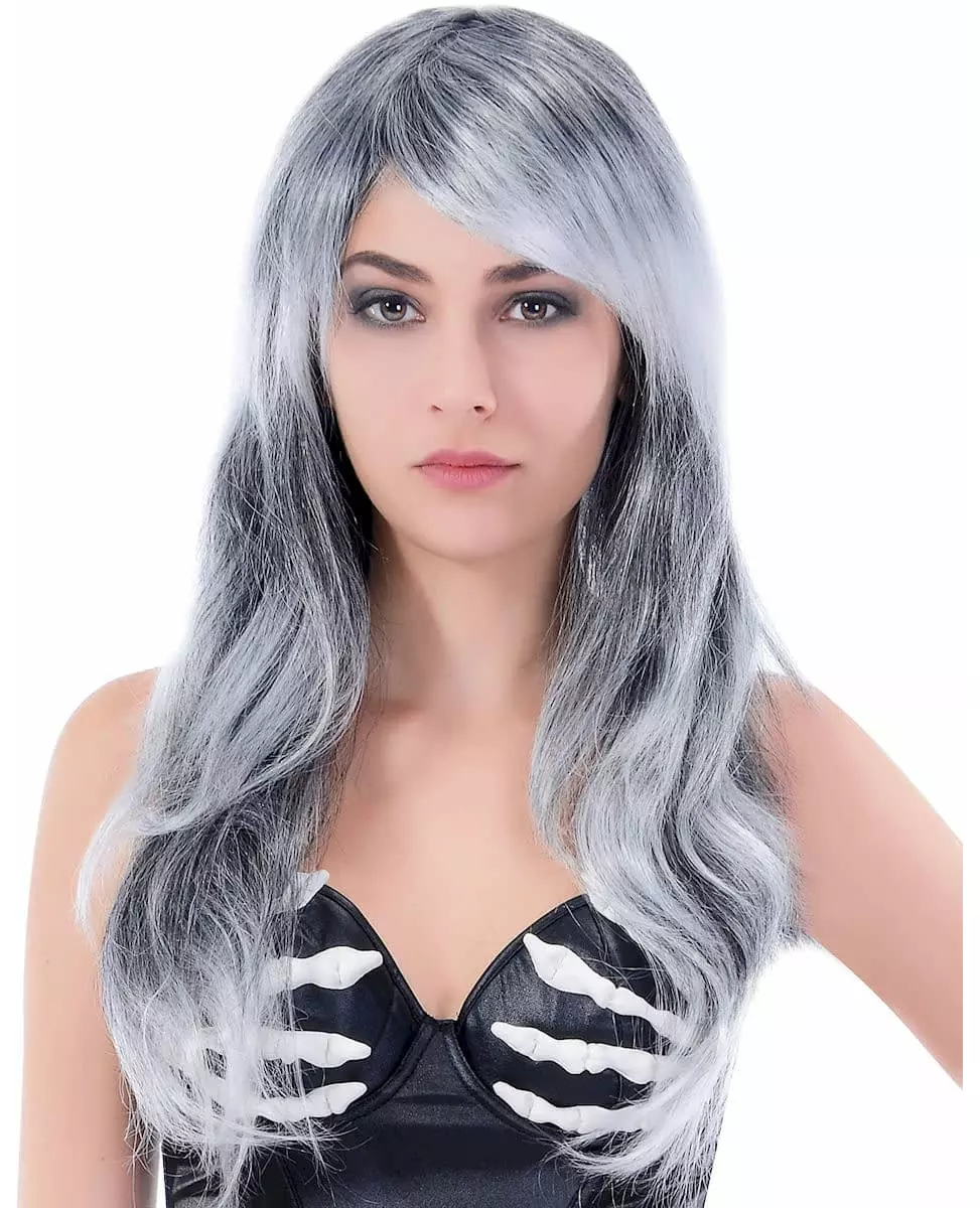 Grått hår uten aldring! Denne parykken for kvinner har langt, bølget syntetisk hår. Den er grå i fargen med en sideskill. Denne parykken er ideell for å fullføre antrekket ditt på temafester eller på Halloween-kvelden med et zombiekostyme. Inkludert tilbehør: Parykkmateriale: Syntetisk hår