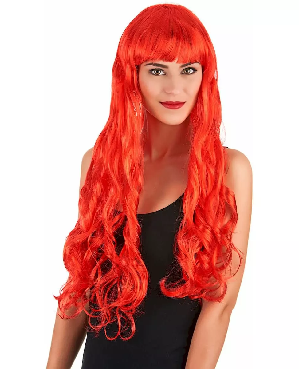 Glamorøs! Denne lange parykken for kvinner er rød i fargen og har pene bølger. Det finnes også en frynse på siden. Dette tilbehøret vil være ideelt for å fullføre havfruekostymet ditt, for eksempel under et kostyme eller et temaarrangement. Inkludert tilbehør: 1 parykk Materiale: Syntetisk
