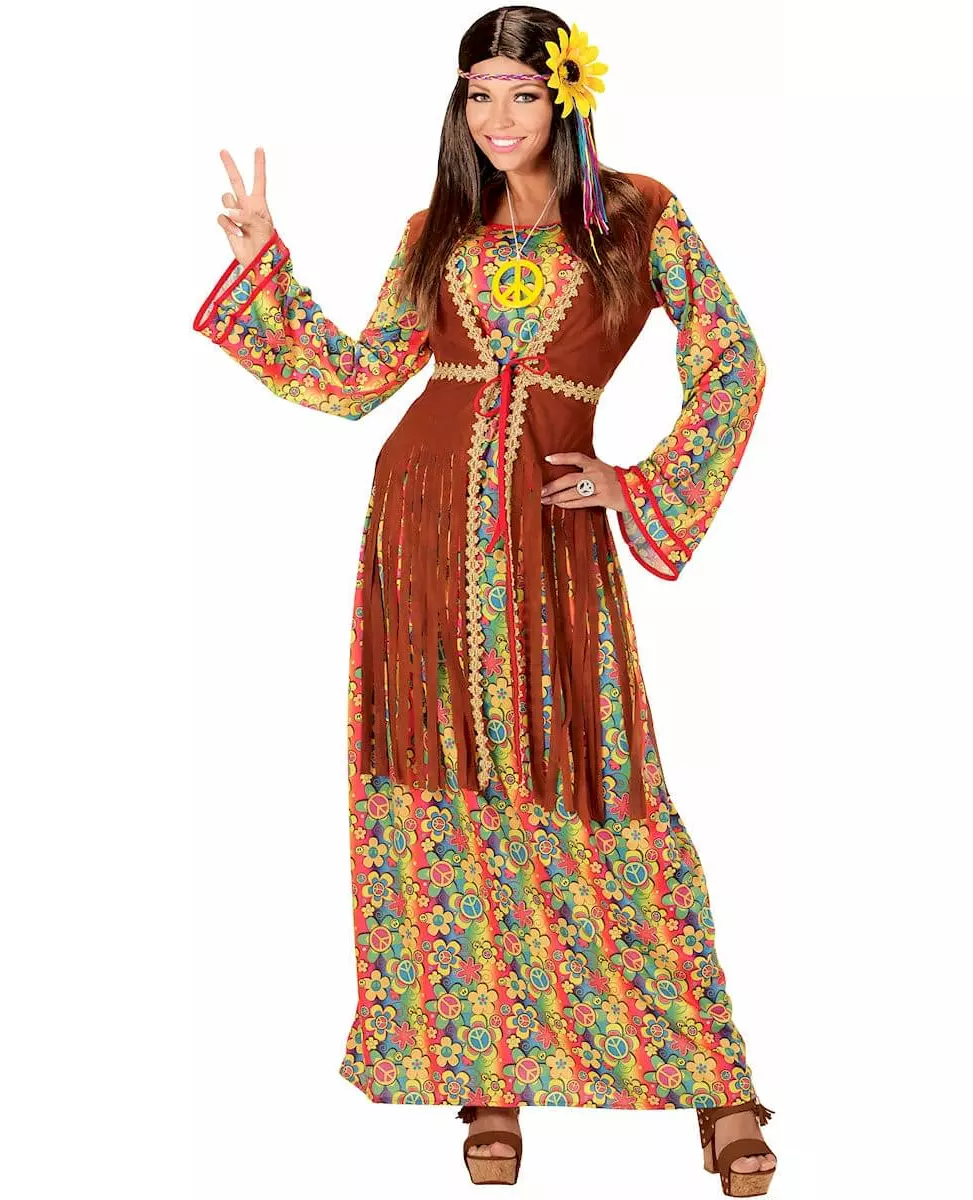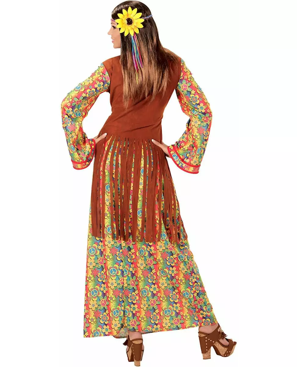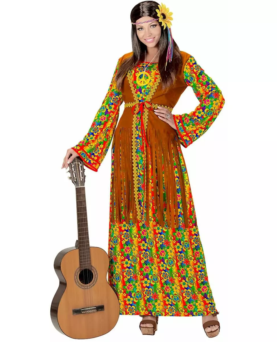 Litt blomster, mye farger og massevis av fred og kjærlighet! Dette kostymet for voksne består av en kjole og et halskjede. Den veldig lange kjolen er fullstendig utsmykket med fargerike mønstre relatert til hippie-looken: fred- og kjærlighetssymbol, et lykkelig smilefjes og til og med flerfargede blomster! Med sine lange, utsvingte ermer tar den oss rett tilbake til 70-tallet! Den brune vesten sydd over kjolen har semsket skinneffekt og er dekorert med gullflette og frynser. Til slutt består halskjedet av det berømte fred- og kjærlighetssymbolet i gul plast og en hvit snor. Et komplett hippiekvinnekostyme for en vellykket kostymefest med 70-tallstema!   © Copyright Widmann SRL. Inkludert tilbehør: Kjole med vest Halskjede Materiale: 100 % polyester Vedlikehold: Håndvask Målinformasjon: For en størrelse XS måler kjolen omtrent 141 cm.