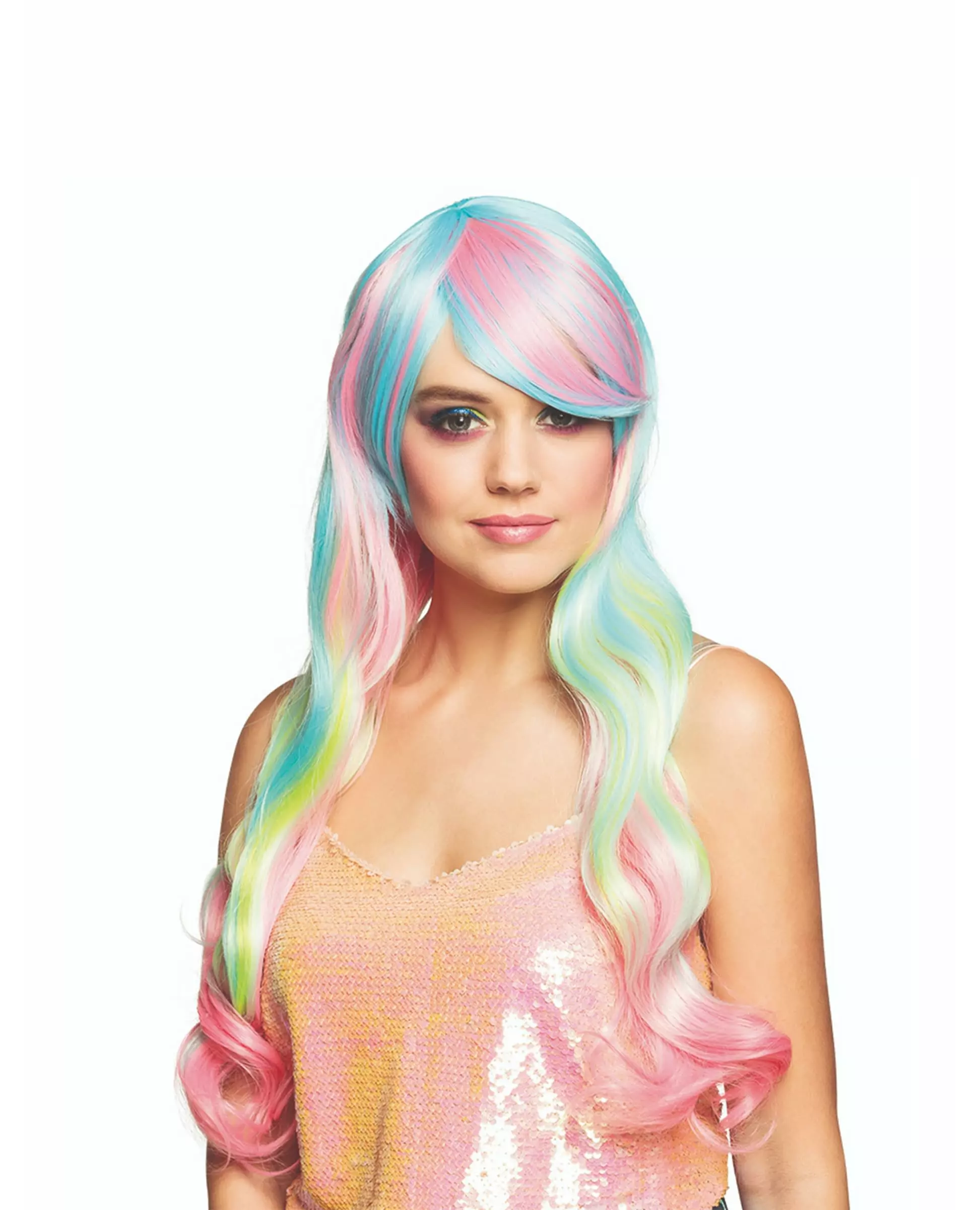 Lang pastellfarget regnbuefarget parykk for kvinner